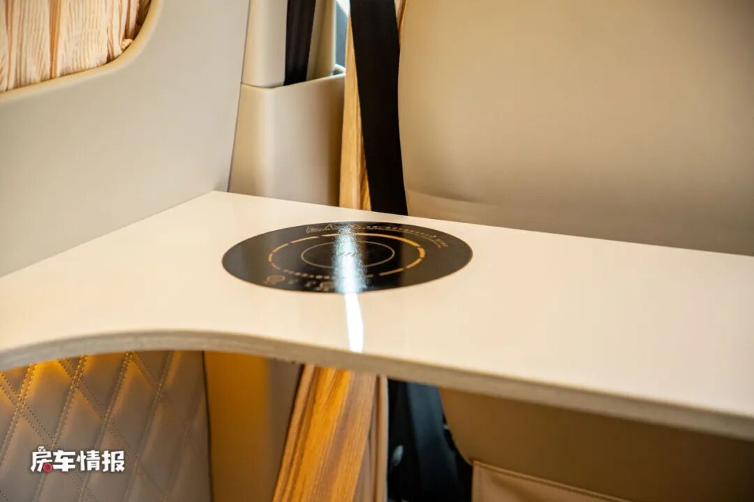 在内侧航空座椅的前方还设计了一个带有小型电磁炉的桌子,不过我个人感觉这个桌子其实后期可以变成折叠的餐桌,这样就可以预留出更多的腿部空间。