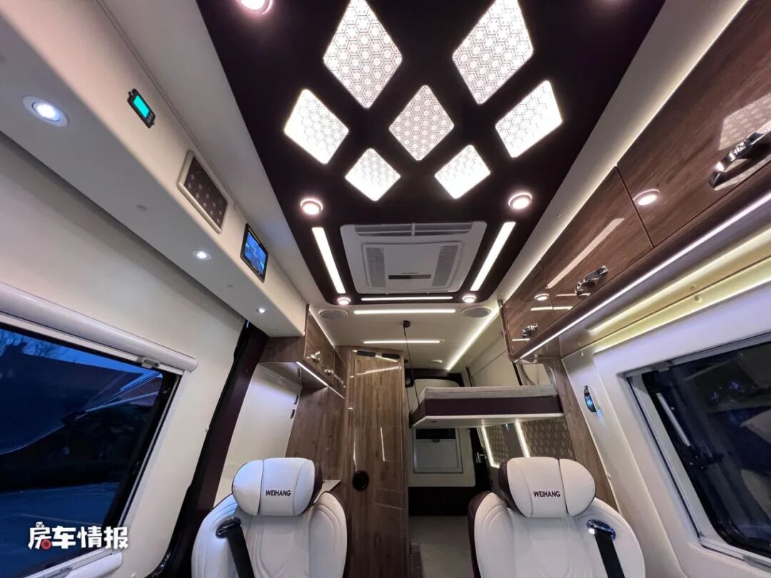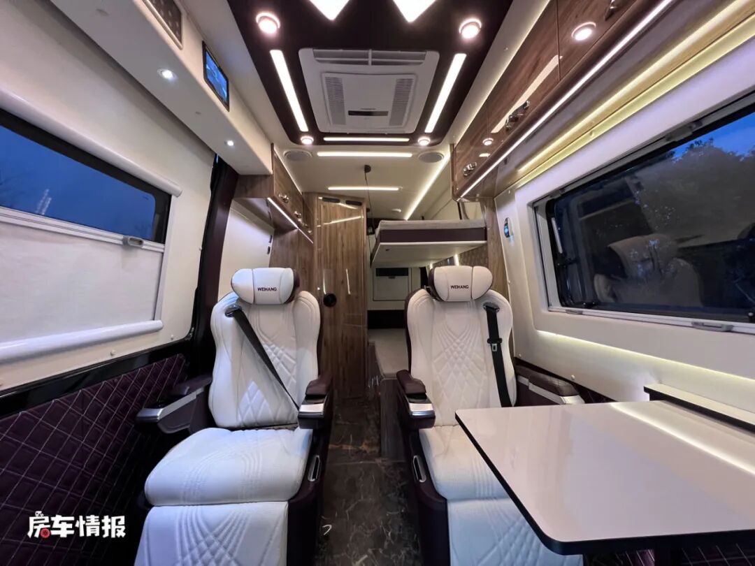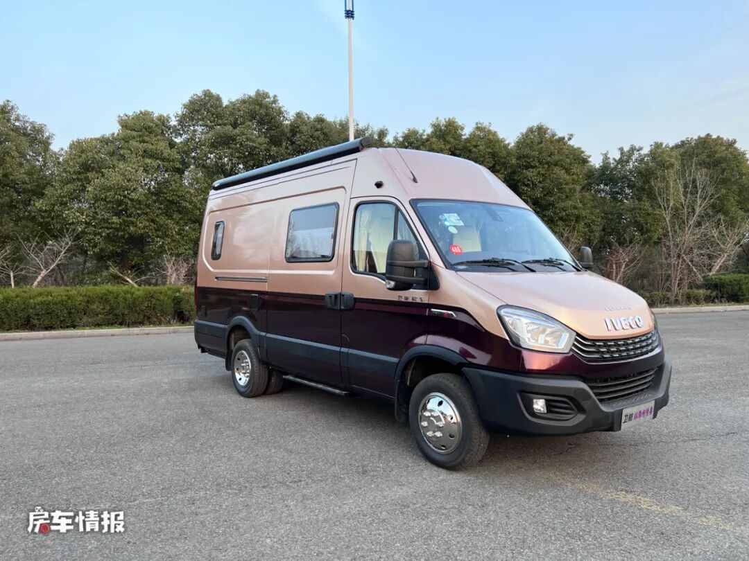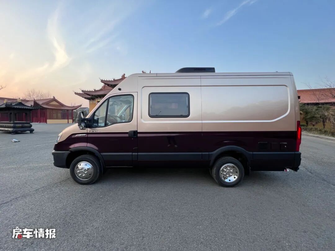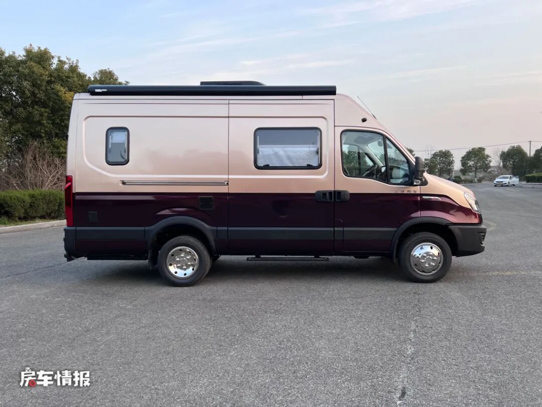这款车和之前卫航的F590野兽的配色十分相似,采用了金色和咖色的搭配,使整体的品牌辨识度很高,不过不同的是这款车是采用了依维柯欧胜的底盘,所以在整体尺寸上也稍大一些,长宽高分别为5999*2011*2754mm,临界6米的长度也可以保证内部生活区的空间,而整体的高度因为不到2.8米,所以相较体型较大的C型房车,在通过率上更有优势一些。
