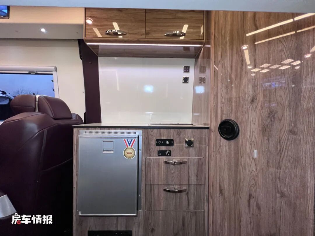 位于外侧座椅后方的是整辆车的厨房操作台,虽然尺寸并不是很理想,但是也提供了基础的设施,包括翻盖的洗菜池以及50L的车载冰箱,侧面墙壁也提供了220V的电源口,后期搭配上便携式的电磁炉或者卡式炉,就可以解决日常的烹饪需求了。