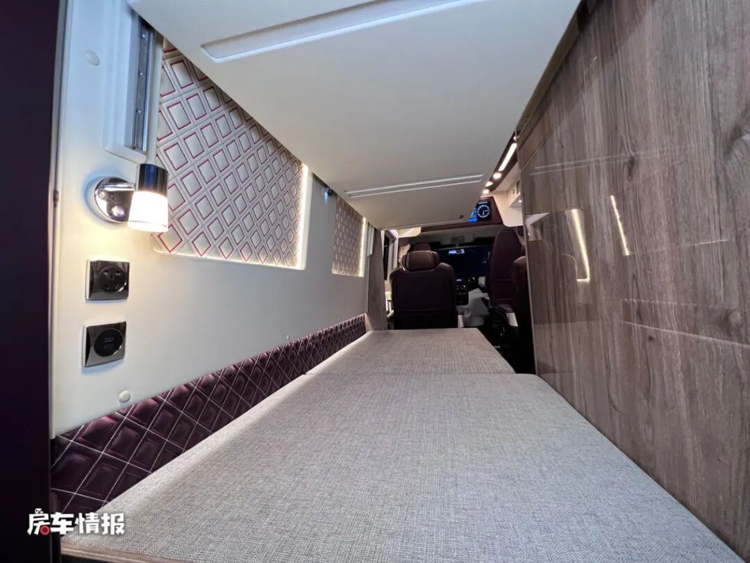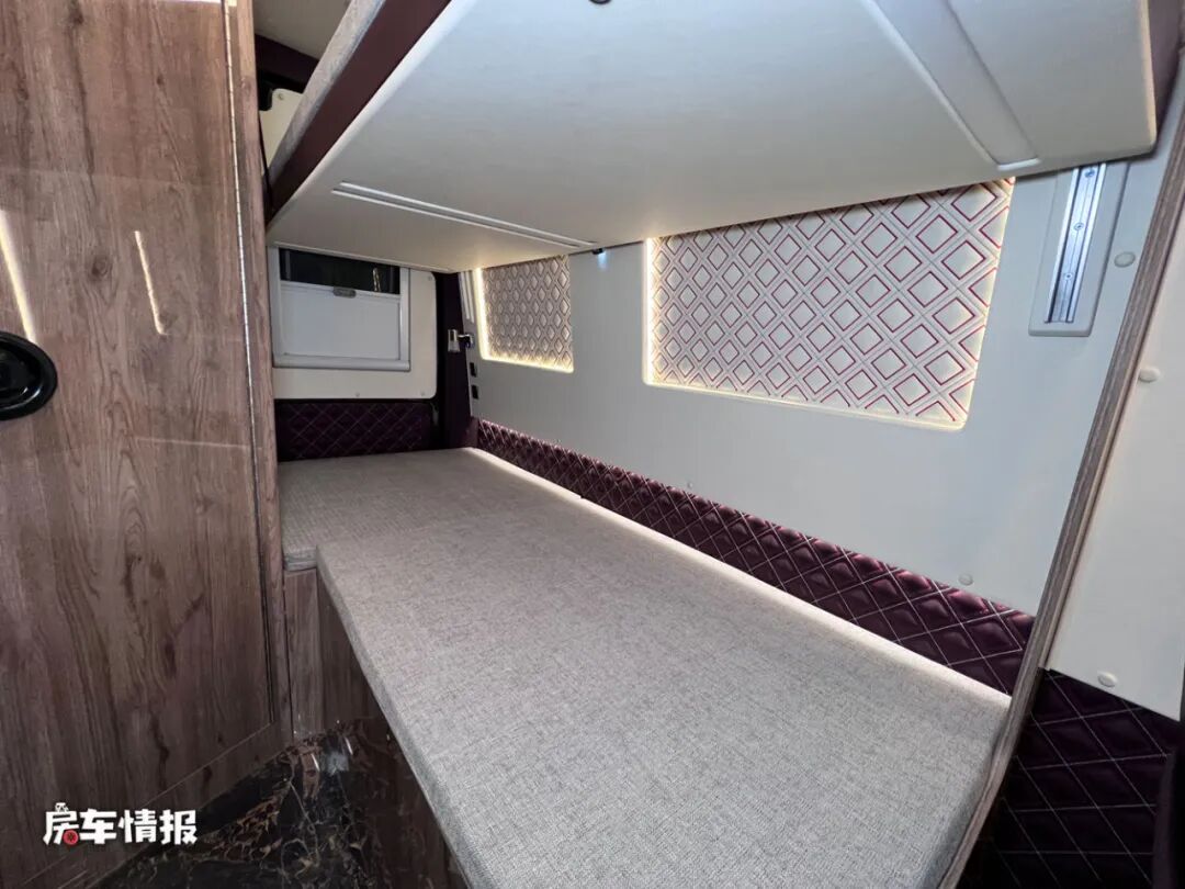 虽然是一辆核载4个人的车型,但是车内还是比较适合两个人居住的,因为整车的休息区采用的是上下单人床的设计,下铺是固定式的床铺,尺寸为1950*880mm,上铺是一张电动吊床,尺寸为1850*650mm,正好可以满足两个成年人的睡觉休息需求。