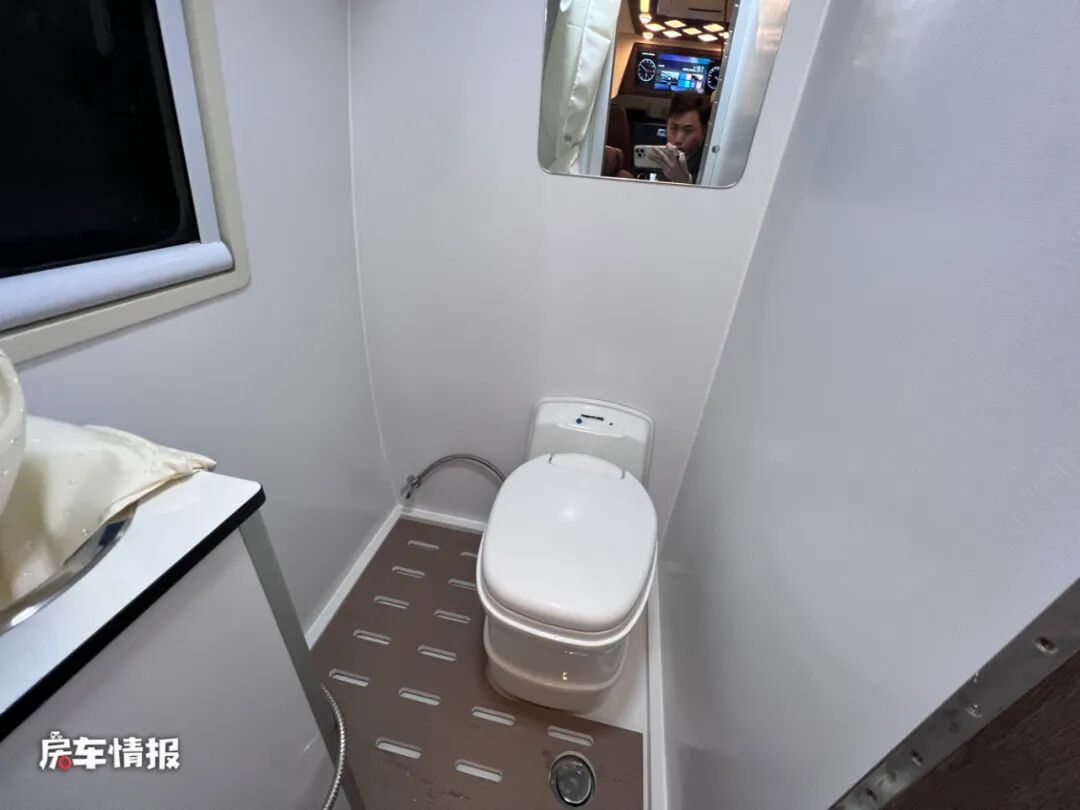 因为厨房操作台的面积减小了,所以留给后方卫浴室的面积也就增大了,相比同级别的B型房车,空间表现上还是不错的,带有可旋转的盒式马桶、洗手台盆、淋浴花洒和梳妆镜,可以满足日常的基础洗漱需求。