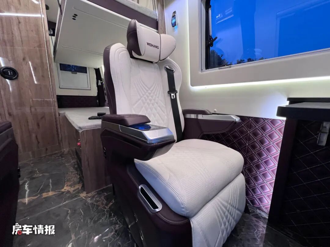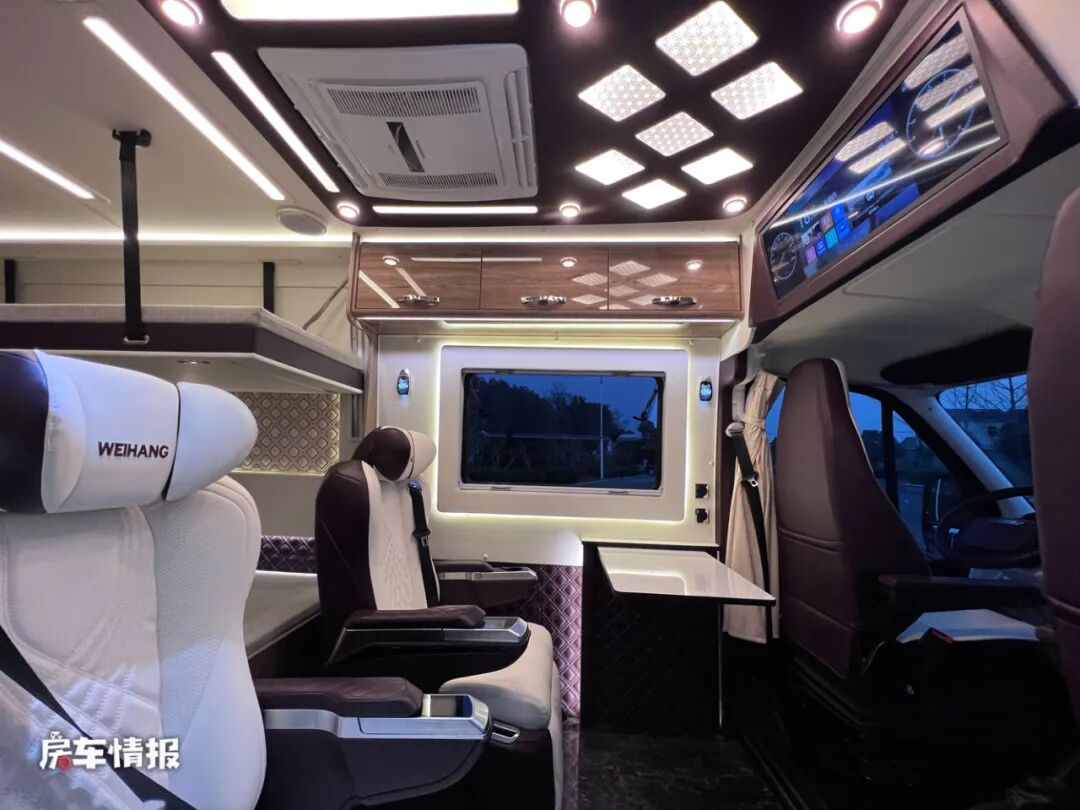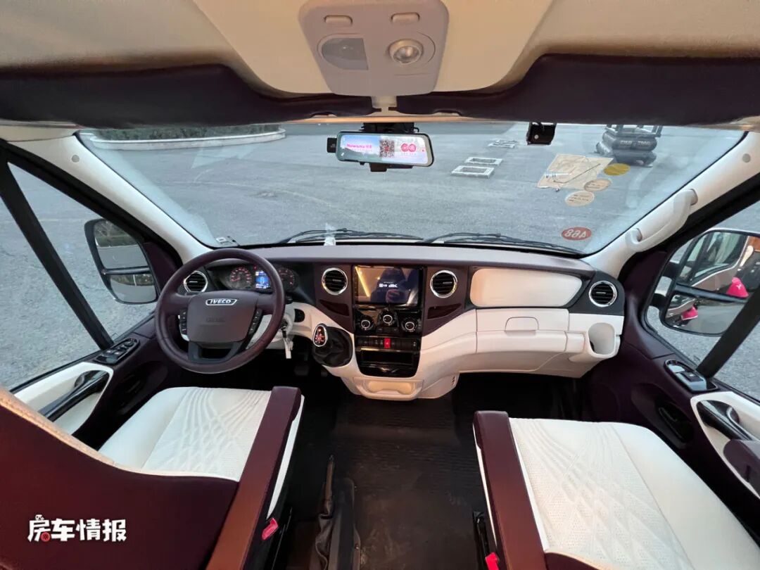动力上,这款车依旧是搭载了一台3.0T的柴油发动机,匹配采埃孚8AT变速箱,最大功率为125kW,最大扭矩是400N·m,满足最新的国六排放标准,不过不得不说的是,驾驶室内部为了和后方的生活区达到统一的色调,同样采用了棕红色的皮质软包工艺,不仅提升了整体车内的美观度,而且也提升了内饰的精致度,另外驾驶室内也标配了多功能的方向盘、彩色中控台以及流媒体的后视镜(选装),为日后的驾驶提供了更多的便利性。