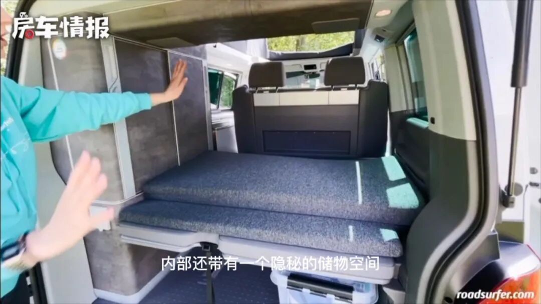 打开车尾门,内部还带有一个隐秘的储物空间,可以很方便地把户外折叠椅放进去,而户外餐桌尺寸比较大则被隐藏在车门板内部。座椅拼床也十分简单,将头枕翻折后,可以直接将座椅靠背向后放平,这样就能拼成另一张双人床。尺寸差不多是1米15乘2米。两侧还提供了抽拉式遮光帘,可以提升私密性。