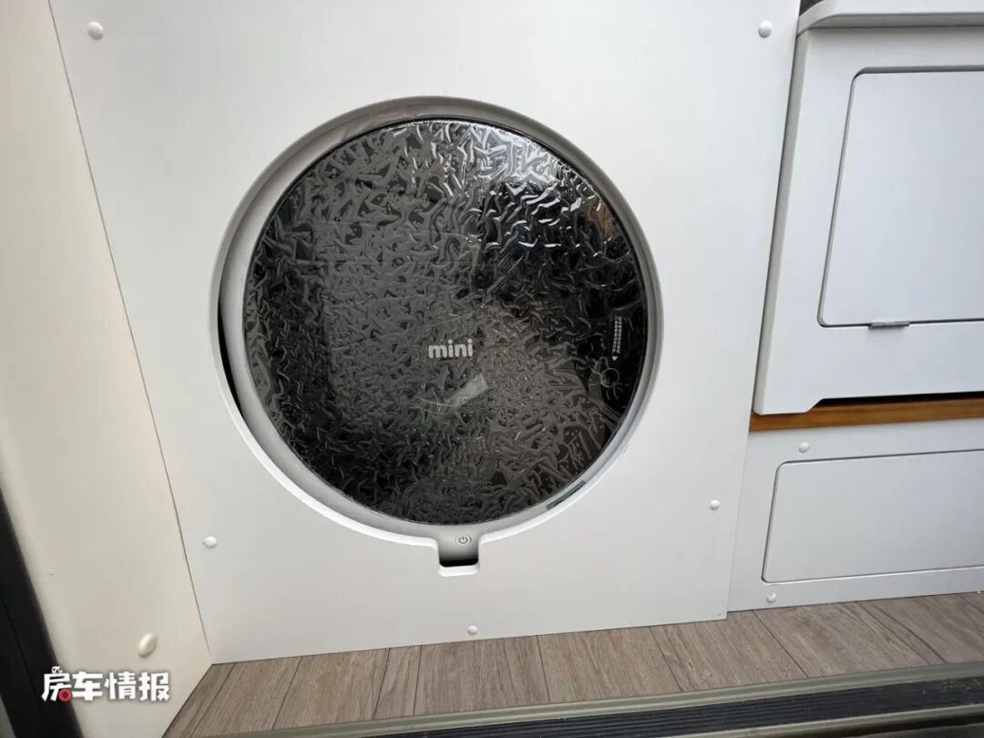 打开后尾门,可以看到在一侧沙发下方还嵌入了一台小型的洗衣机,以满足日常的生活需求。