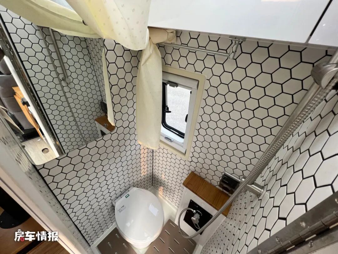 与之对面的卫浴室设计可以说是整辆车最大的“亮点”,之所以这么说是因为里面的装修足够“花哨”,采用了马赛克式的墙壁装饰,不过相较之下,内部的空间有些不尽人意,略微有些小,但也提供了基础的配置,包括马桶、独立的淋浴花洒、镜面的储物柜等,也可以满足日常的基础洗漱需求。