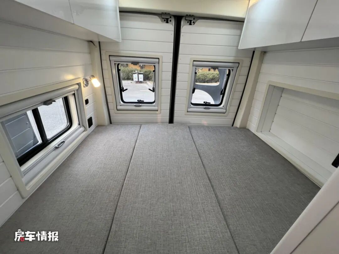 作为一辆标准的B型房车,整辆车具有不错的道路通过率,长宽高的尺寸分别为5940*2755*2110mm,除去基础的手动遮阳棚和水电接驳口,这款车在车尾部还加入了银色的爬梯以及自行车架,车顶的顶置空调和行李架也用了和车身相同的银色配色,看起来更加的融洽。