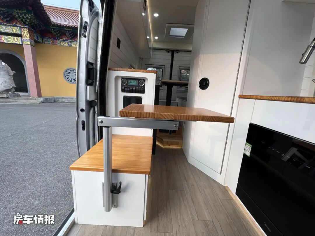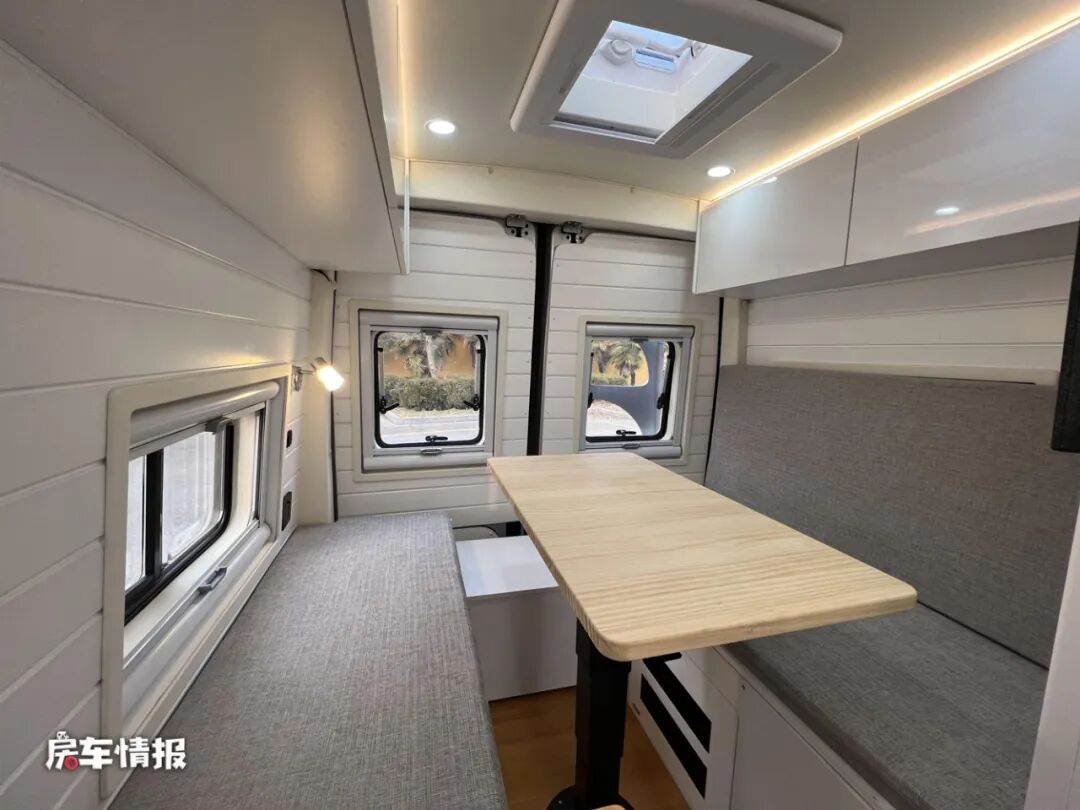 车厢尾部平时是一个超大尺寸的会客区域,不过由于并没有配置安全带,所以行车时不能够乘坐,但是驻车之后大家就可以坐在这里小聚或者就餐,天气好的时候还可以打开后尾门,为车内输送清新的空气,另外车内的墙壁也是采用了VanLife特有的横条木纹式设计,让人感觉特别的清爽舒适。