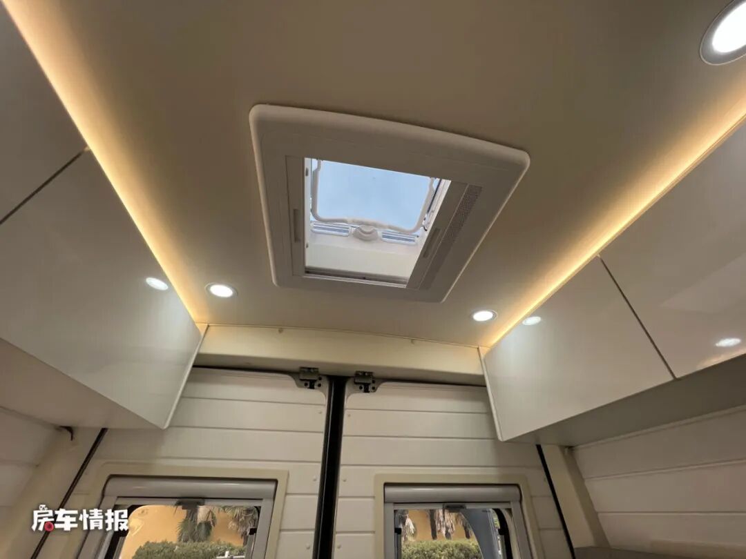 车内的厨房区分为两个部分,一个是位于主驾驶座椅后方的主操作台,带有基础的电磁炉和水槽,不过这个水槽的设计也比较特别,是采用了倾斜式的设计,这样的设计现在一般在家用厨房中可以看到,因为它可以更好的疏散水流,不会导致存水溢出,另外顶部还配置了一台抽油烟机,对于日后的使用还是提供了一定的便利性,除了水槽的新颖小设计,厨房区的侧窗也是采用了平开式的设计,这样即便在行车时也可以开启,使用起来也更加的灵活。