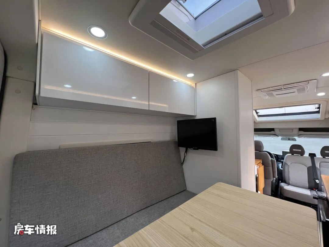 在动力方面,全车是采用了一台2.0T的柴油发动机,匹配6AT变速箱,最大功率110kW,最大扭矩为375N·m,满足最新的国六排放标准,结合整体的车身尺寸,也符合蓝牌C本的驾驶规定,不过和之前那款VanLife车型不同的是,这款车的驾驶室内采用了一主两副的座椅设计,且副驾驶座椅带有向后旋转的功能,所以在行车过程中,全车可以乘坐三个人。