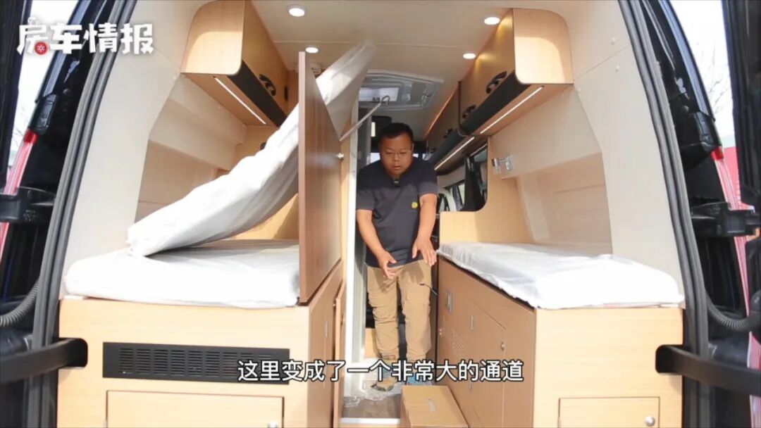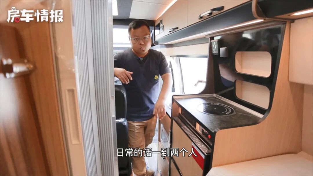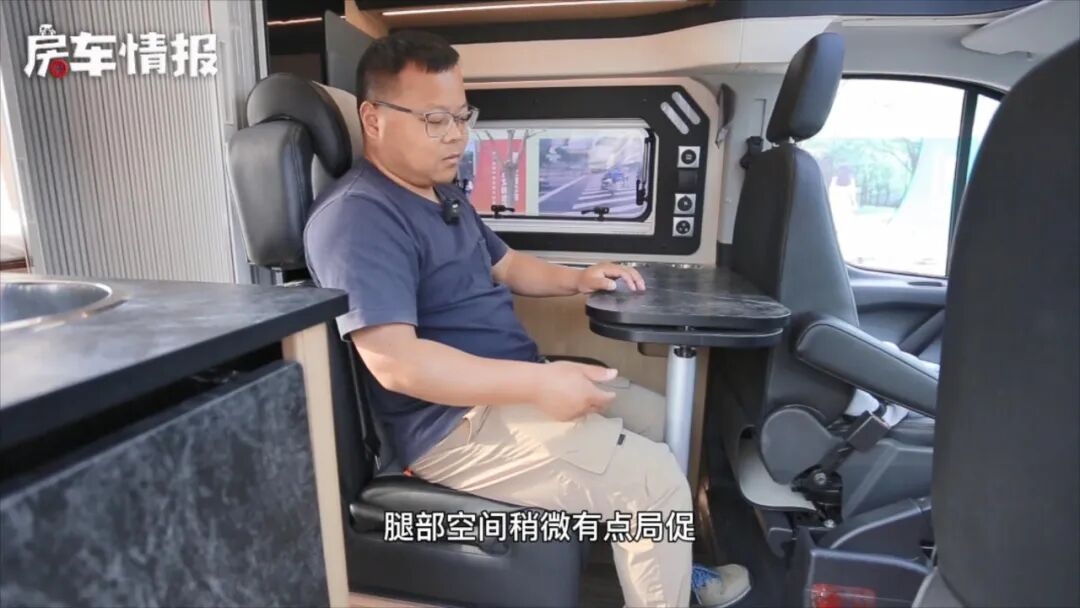 受限于车身尺寸,生活区的空间就没有那么宽裕了,前后排共4张座椅,日常一家四口出行都能坐得下,但后排乘坐的时候一定要记得把小餐桌取走,要不然腿部空间实在有些憋屈。虽然空间小,但依然提供了独立卫生间、厨房,车尾还有一张1900*1200的双人床,想我体型偏胖,和一个比较瘦的人也可以躺下,如果是两个比较瘦的人就更舒服啦,详情来看视频吧~注:具体配置和价格以厂家公布为准!