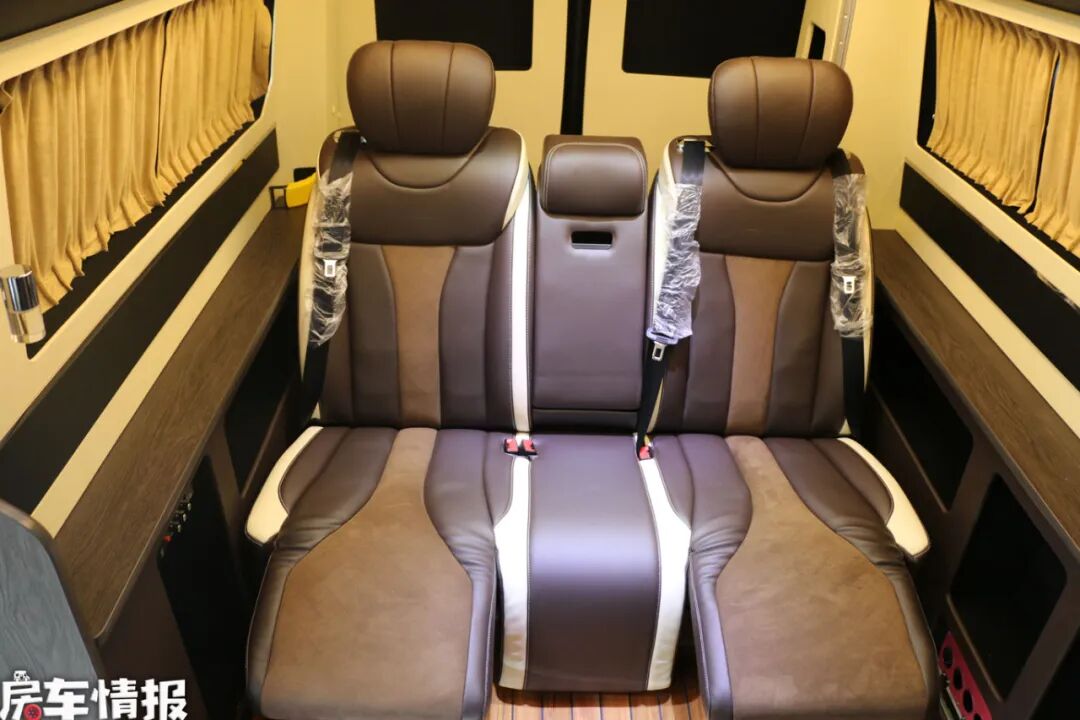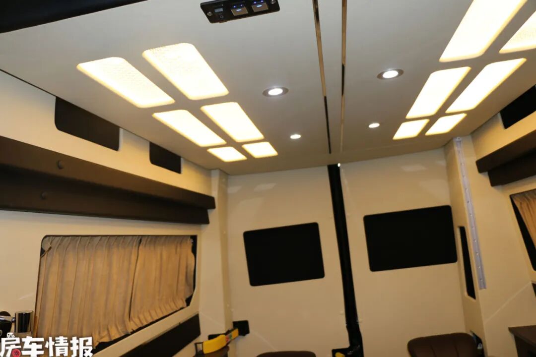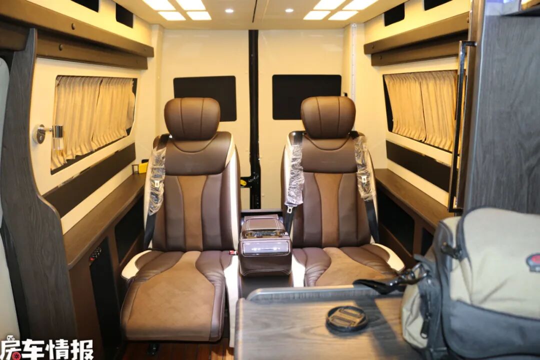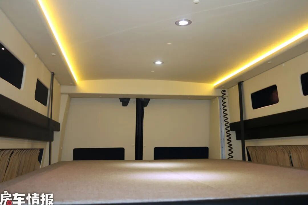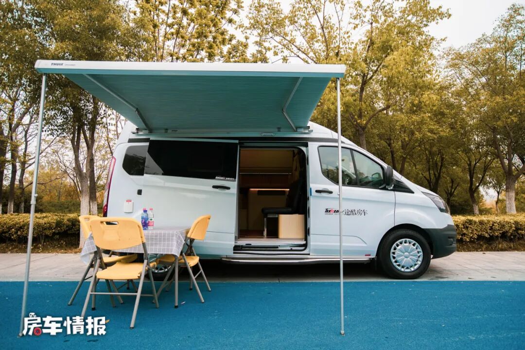 和日常MPV不同的就是车厢外部带有一个手动的遮阳棚和基础的水电接驳口,这也让整辆车有了明显的辨识度,不过总体上看,整辆车还是比较低调的。