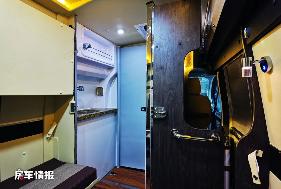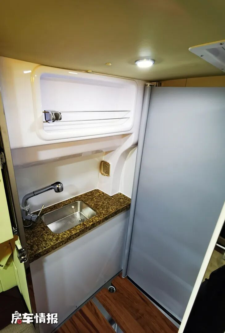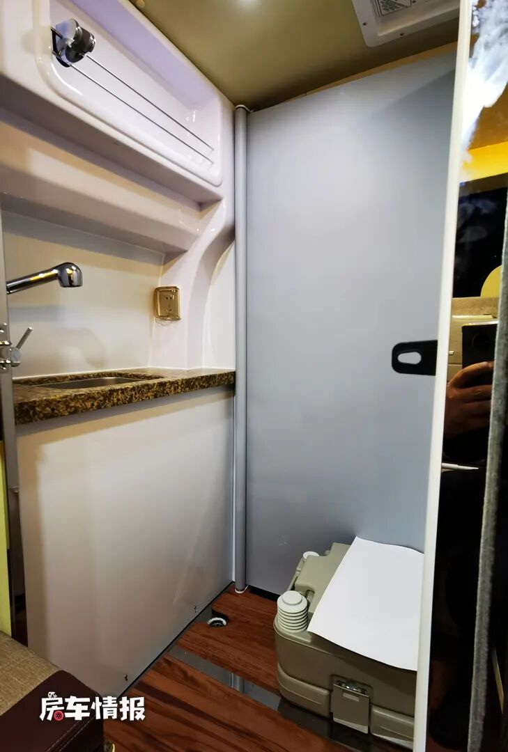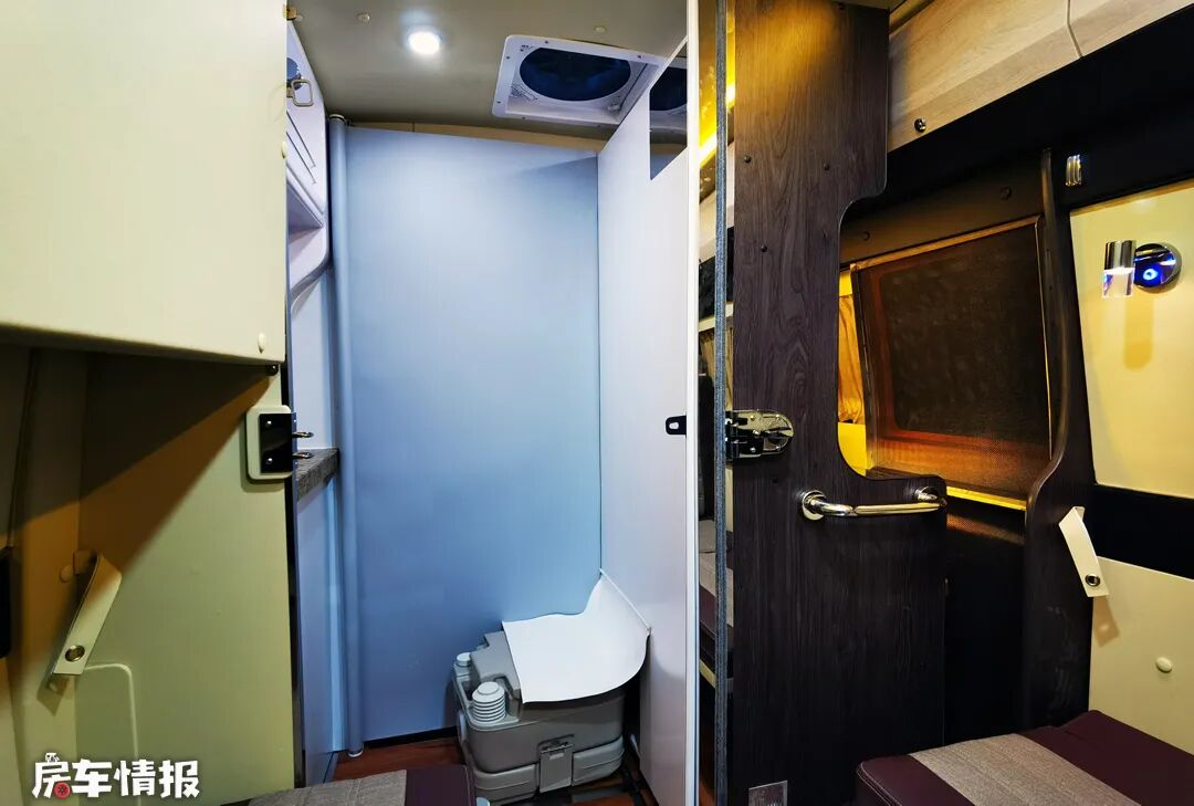而整辆车的卫生间就隐藏在厨房操作台的后方,将操作台整体向外拉伸,就可以看到后方的独立卫浴室,打开之后的内部空间也能满足一个人的洗漱,配有抽拉式的水龙头、盥洗台、换气扇和便携式的马桶,日常的基础洗漱淋浴和如厕需求也是完全可以满足的。