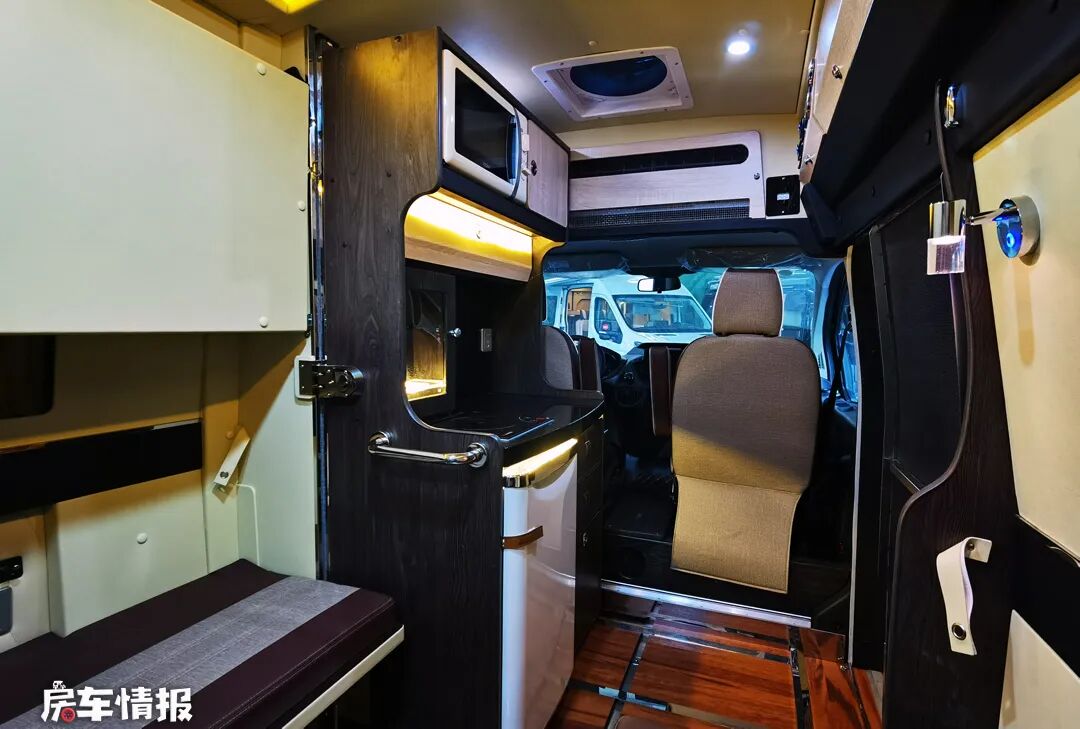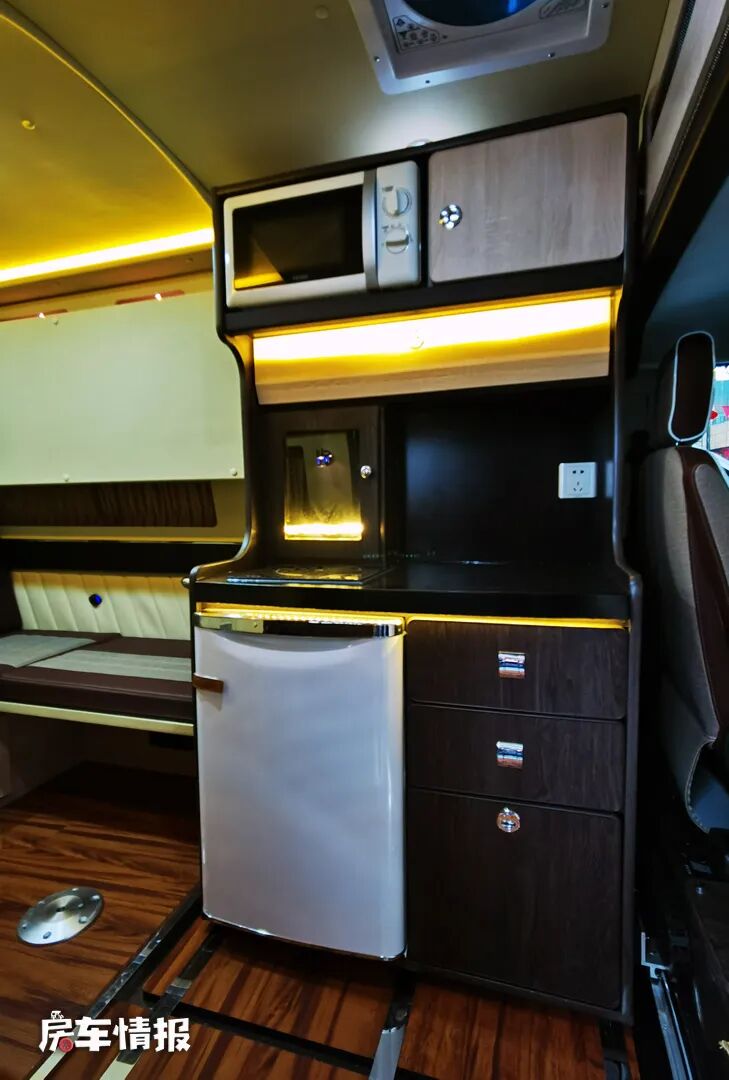 除了睡卧的功能,房车相对MPV型汽车最大的优势就是拥有基础的生活区,这款车依旧采用了途酷的专利设计——隐藏式可移动卫生间,从外观上看,是一个配置比较齐全的厨房操作台,提供了带盖的不锈钢水槽、电磁炉、微波炉和71L的车载冰箱,因为带有外接电源口,后期也可以加装一些小型的厨用电器,满足更多的烹饪需求。