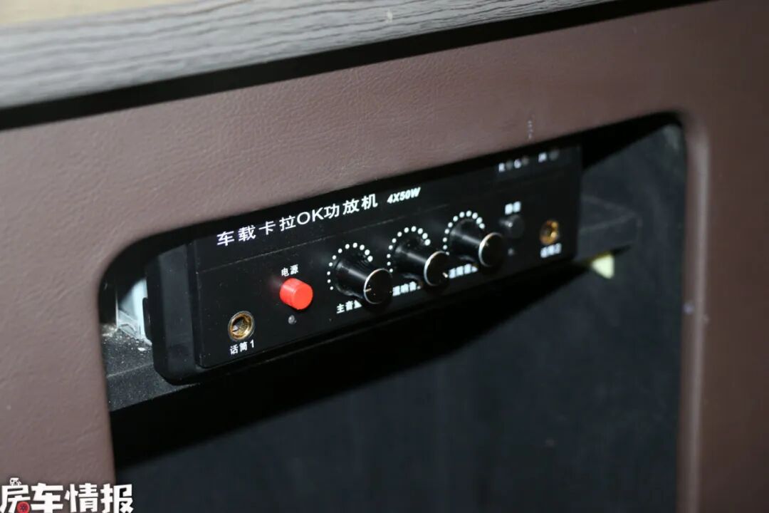 最有意思的是,这款车在后排乘客座椅的侧面,还嵌入了一套微型的车载卡拉OK功放机,不仅可以在山清水秀的地方连接上麦克风高歌一曲,另外在观看电影电视等节目时还可以拥有一个相对不错的视听效果。