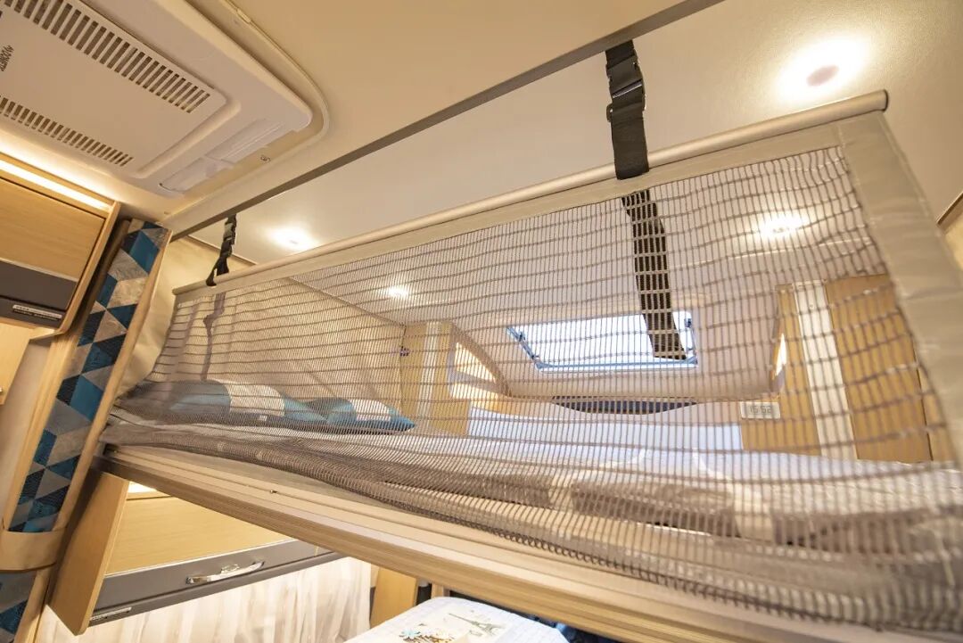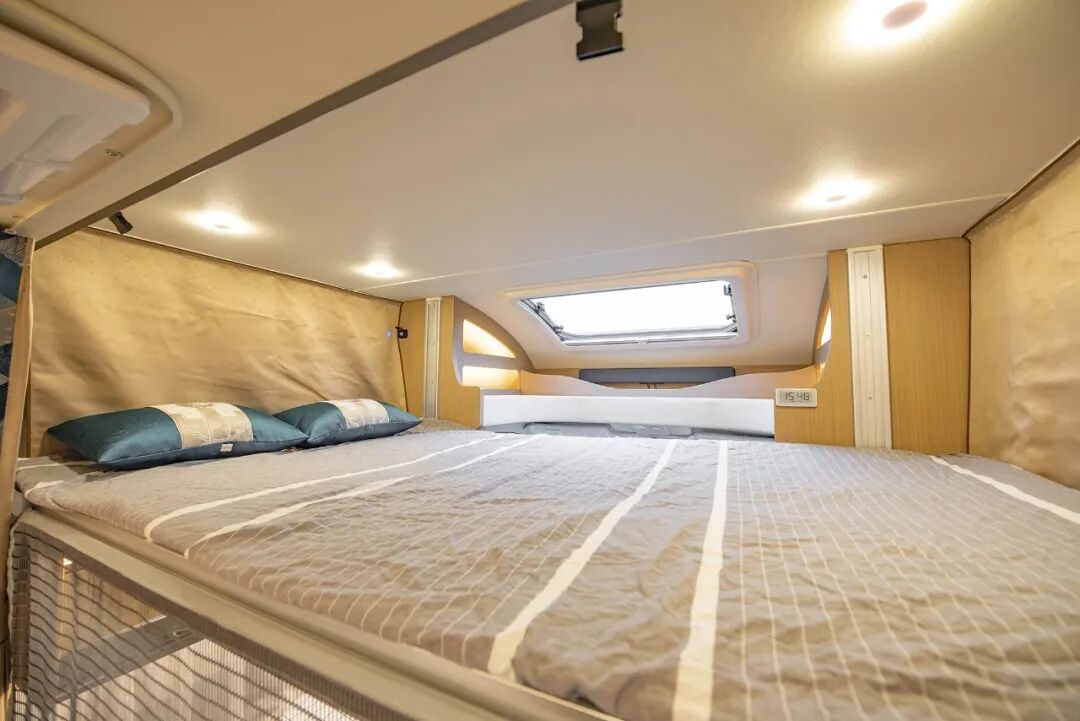 厨房对面是主睡卧区,有一张双人床、床头灯、灯光控制开关及USB充电口。在T800里还有一个秘密开关,那就是客厅的天花板区域,这里竟然隐藏着一张2米*1.3米的吊床,可以睡下两个人哦~而且还有防护网,不用担心跌落。