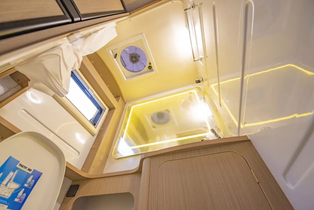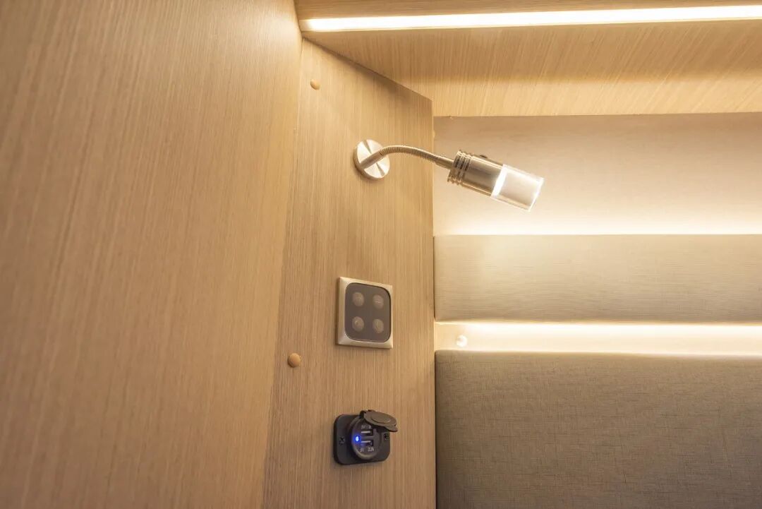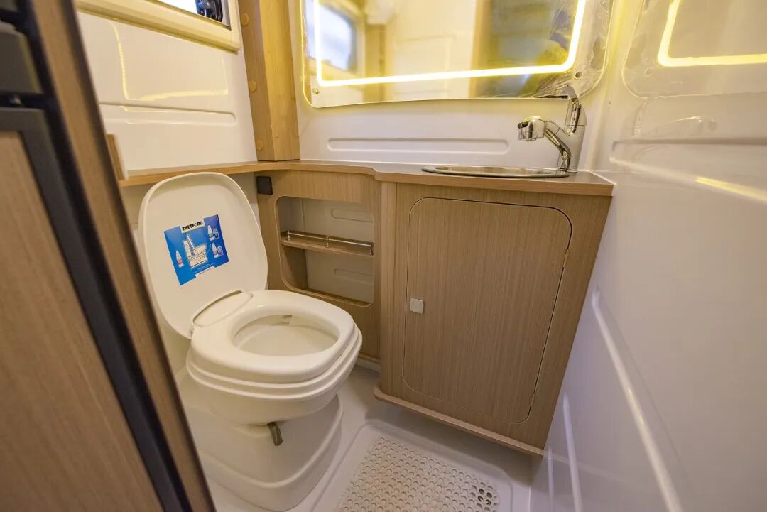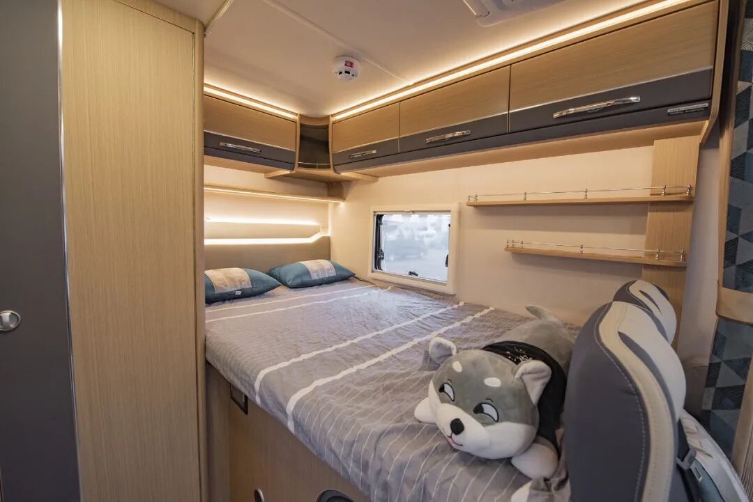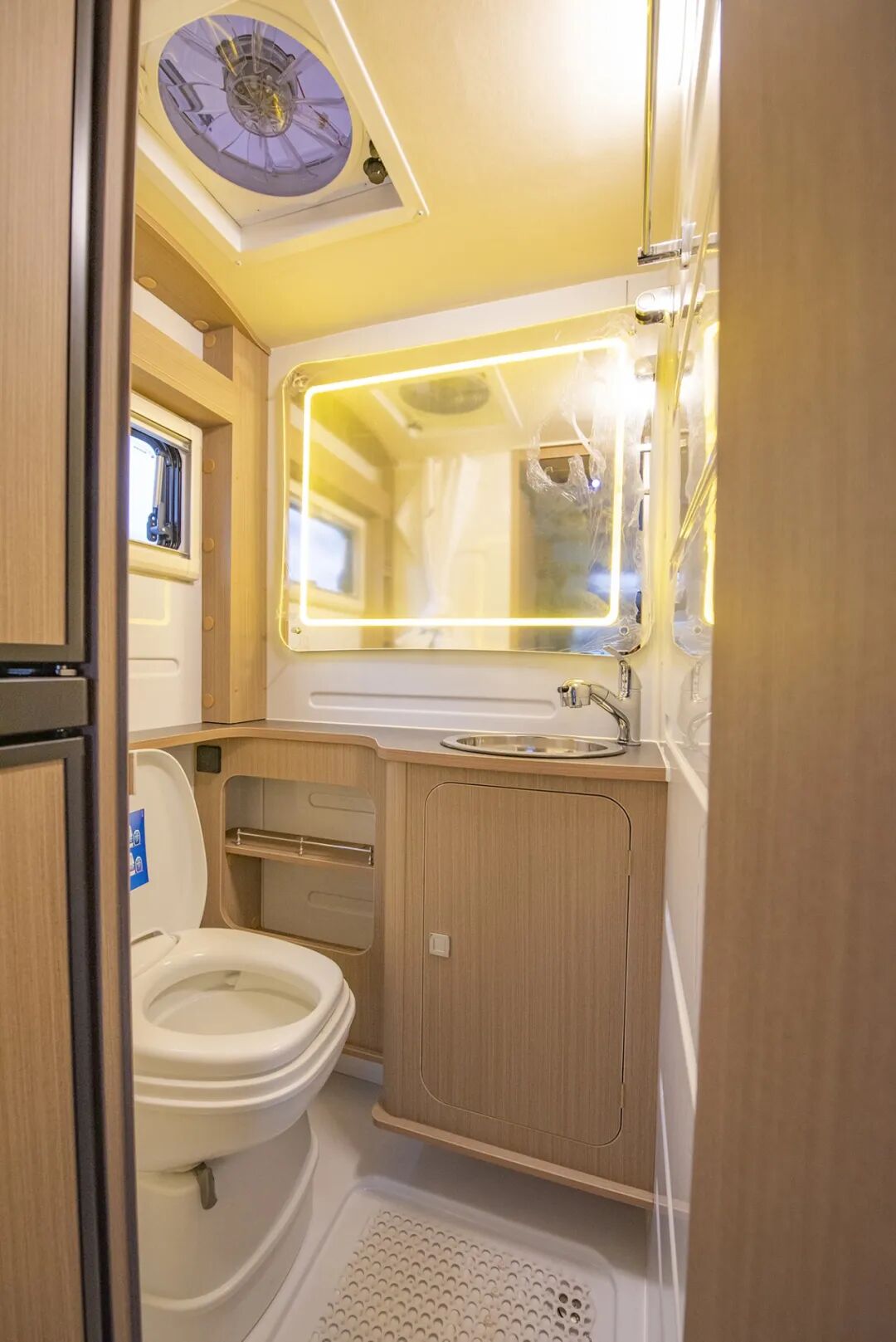 主睡卧区旁边是卫生间区域,标配顶部换气扇、独立暖风出口、超大明星化妆镜还带有照明灯带、进口抽拉盒式坐便器、防水插座等设施。这高级温馨的氛围,为旅途舒适度更加一分。