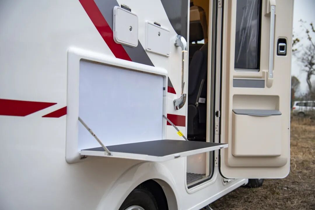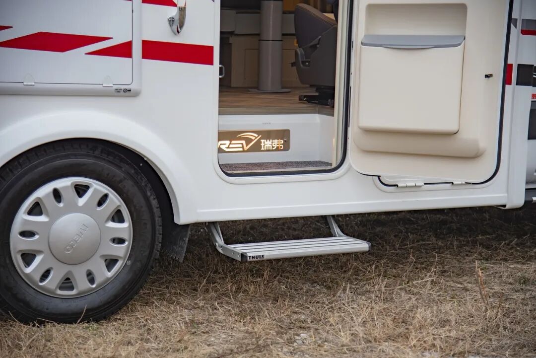 车身采用高强度铝合金结构,正副驾驶室门口装有防滑踏步、房车中门是电动踏步、多个超大储物舱、充电接口、注水口、外置厨房、进口风杆自动收回电动遮阳棚等设备。额头采用的是一体成型复合材料双层车顶并且厚度达到了12cm,整车采用1:1配重平衡设计,更安全。