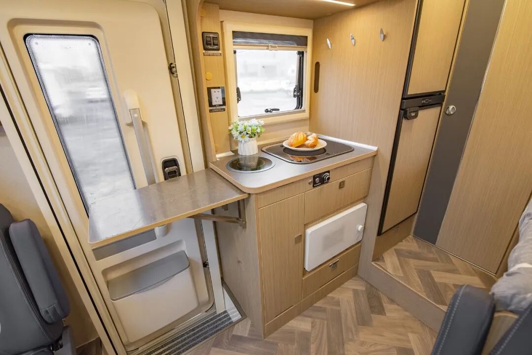 厨房区域共有五组储物柜,房车出行,很多朋友担心小东西太多没地方放,T800轻松解决这些问题。当然,不止厨房,客厅、卧室、卫生间甚至驾驶室上方都有存放物品的柜子或者格子。厨房还配有格兰仕微波炉、电磁炉、不锈钢洗菜盆、220V电源插座、延长桌板及房车专用分区冰箱。这样的厨房配备,让你的房车生活充满烟火气。
