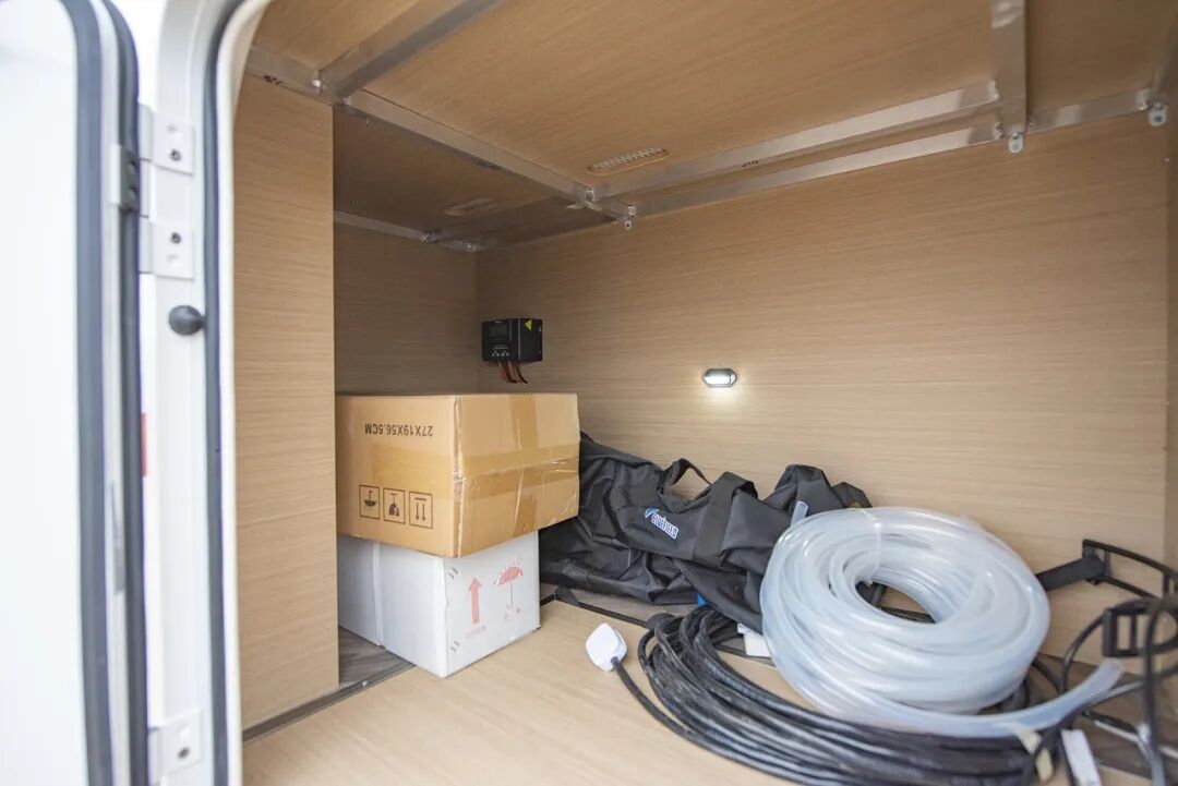最后还是水电配置,本车配备800Ah锂电、200W太阳能、3000W逆变器,230L清水箱、70升灰水箱,还赠送一根15米食品级外接加水管。