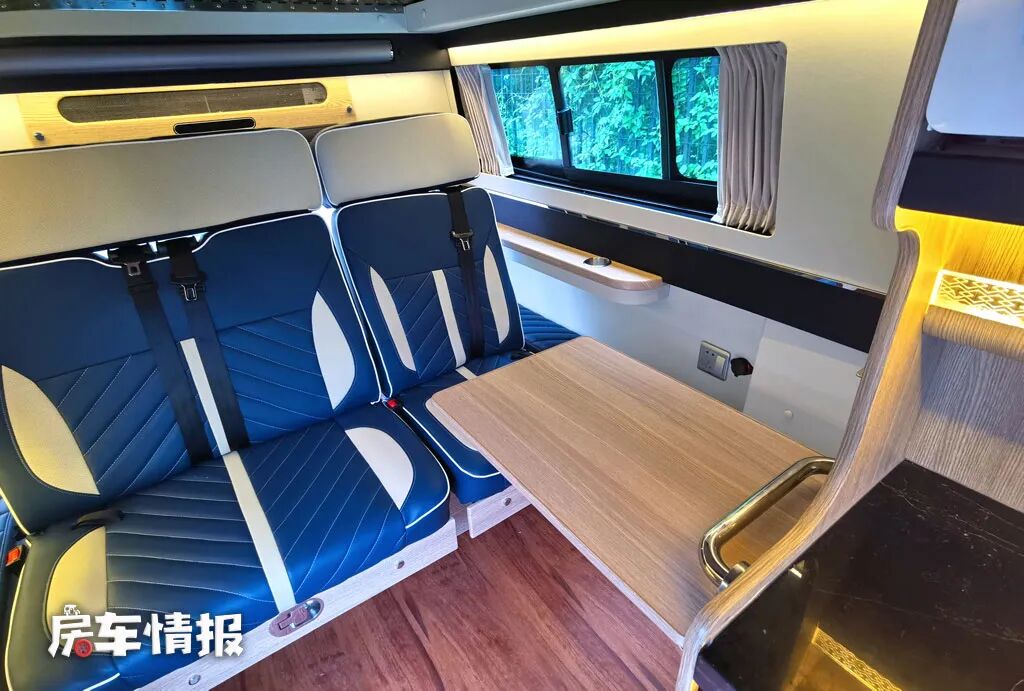 车厢内是提供了三张带有安全带的乘客座椅,所以整辆车在行驶过程中最多乘坐5个人,沙发两侧都带有可以放置物品的置物台以及可以为手机或其他电子设备进行充电的电源插口。