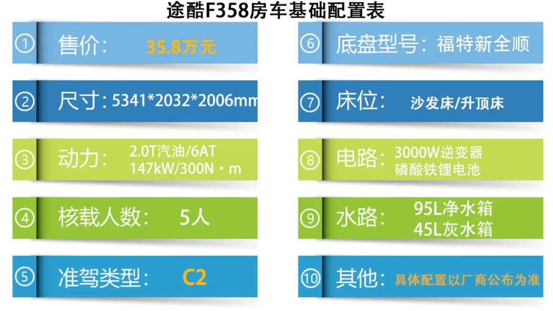 这款搭载福特新全顺底盘所打造的途酷F358房车,不仅可以满足日常的城市道路通过,平时作为家用车也完全不会觉得突兀,又因为顶部的升顶机构可以使整辆车满足4个人的睡卧需求,所以节假日的时候也可以作为一家人的旅行用车,现在这款车的官方报价为35.8万元(具体配置以厂商公布为准),不知道您觉得如何呢?