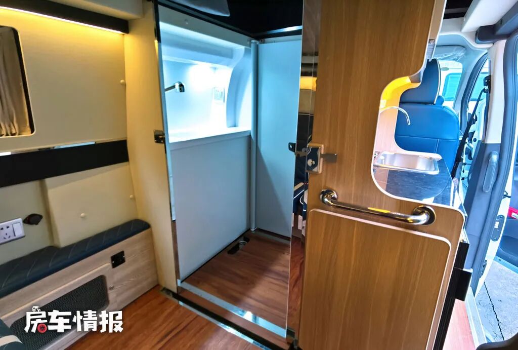 而在全车的顶部则配有升顶机构,这样就能够满足车内正常的站立和活动,从而也可以符合最新的旅居车规定。