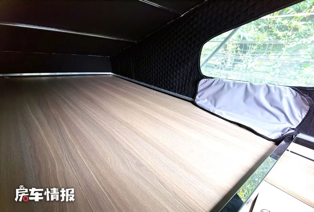 除此之外,在顶部的升顶机构内,则提供了一张双人床铺,日常也可以作为休息的地方。