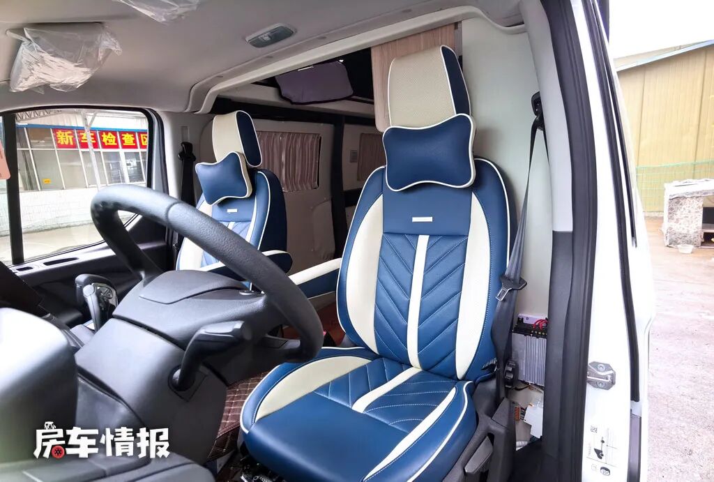 驾驶室座椅也为了搭配后方生活区的内饰而采用蓝色皮质的包覆,并提供了头枕和乘车扶手,可以带来比较不错的驾乘感受。