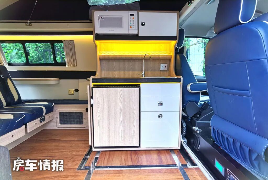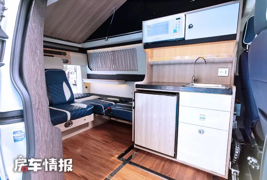 最前方主驾驶室座椅后方是全车的厨房操作台+隐藏式卫浴室的设计,这也是途酷的独家专利设计,从外面看就是一个非常普通的厨房操作台,带有基础的不锈钢水槽、220V电源插口、微波炉、66L车载冰箱和储物空间,后期搭配上便携式的电磁炉,也可以完成日常一些基本的烹饪需求。