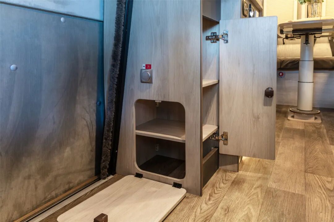 厨台侧面靠近乘客门处还设置有储物空间,两面柜门均可打开,内部分为上下两层,上方可存放日常物品,下方可当鞋柜使用。