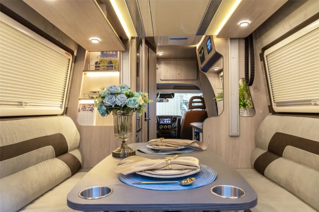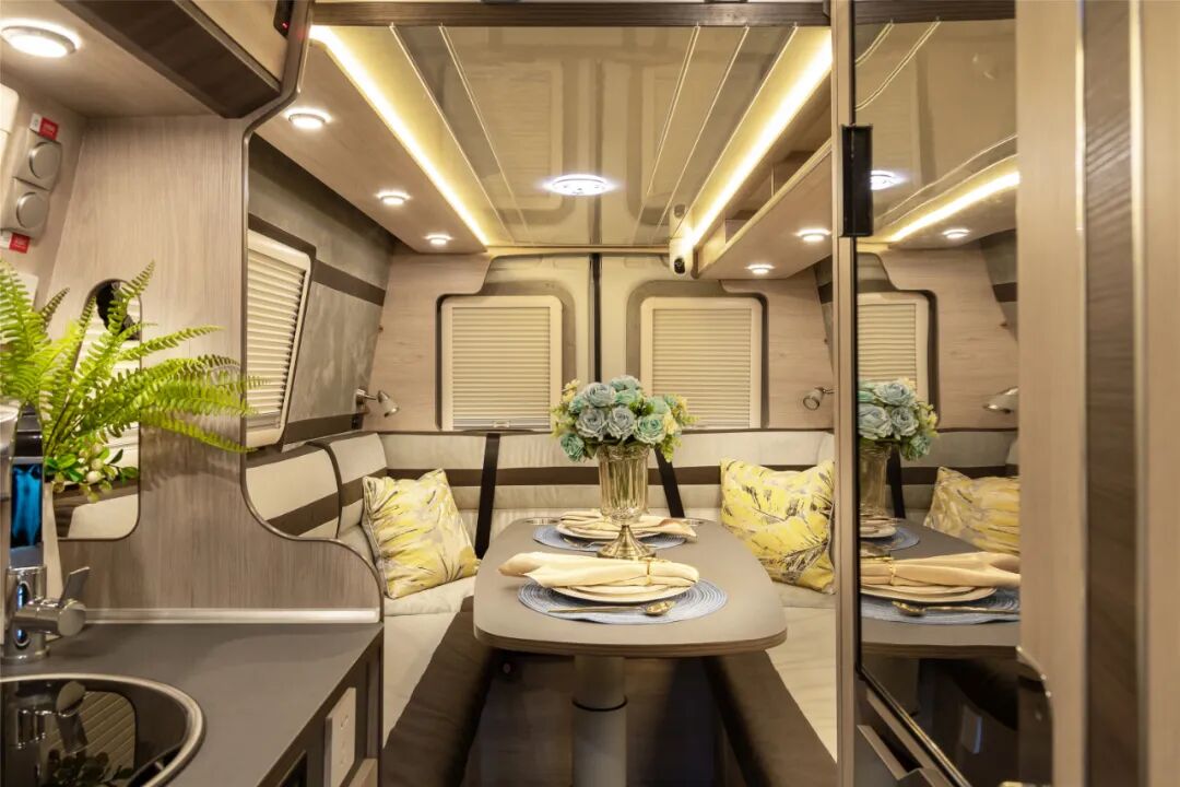 家具颜色选择了白栎木(浅色系),搭配暖色氛围灯营造出一种温馨奢华的氛围。布局方面,从前至后依次为驾驶室、卫生间、厨房区、会客区/车尾升降床卧铺区。