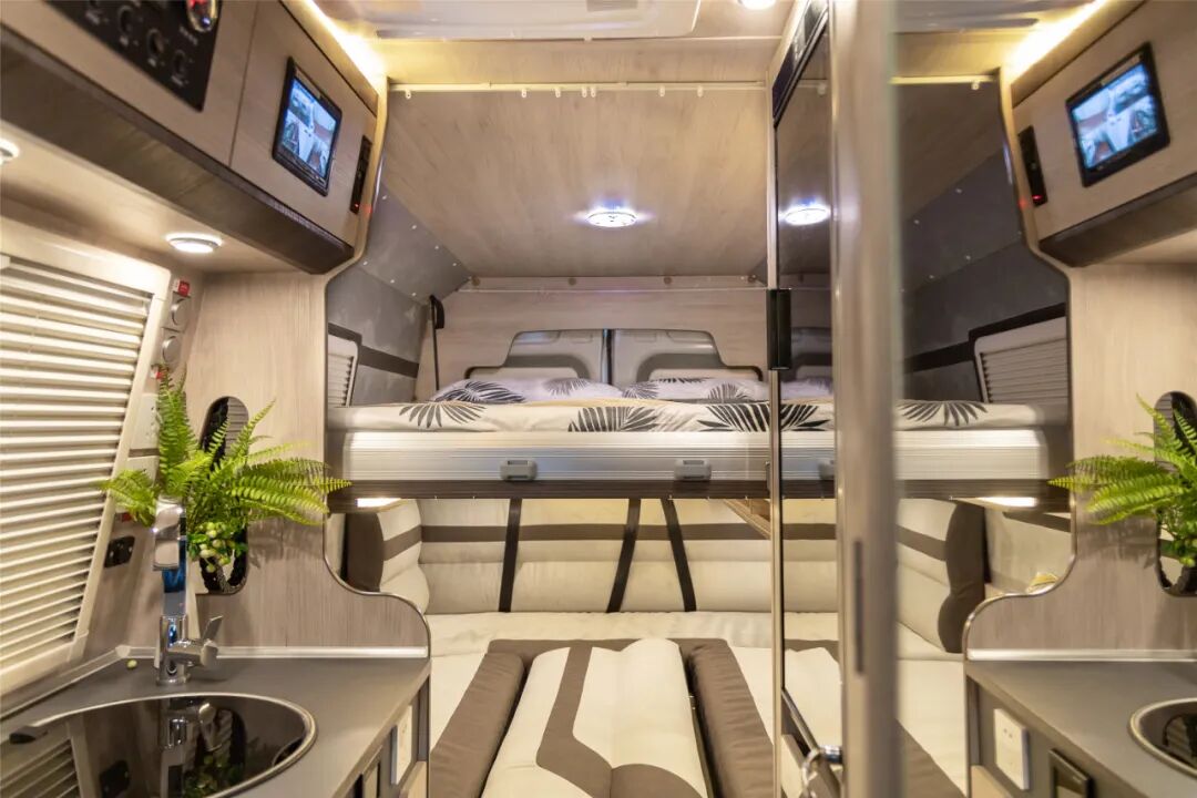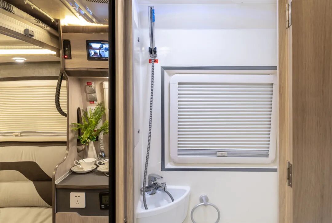 整体式卫生间,内部配备德国进口塞特福德(THETFORD)长凳式马桶(黑水箱 19L),洗手池、梳妆镜、美国Maxxair原装进口7500K双气流换气扇、抽拉一体式淋浴花洒;水路系统方面,100升净水箱、灰水箱40升(手动+电动排污双模式)。