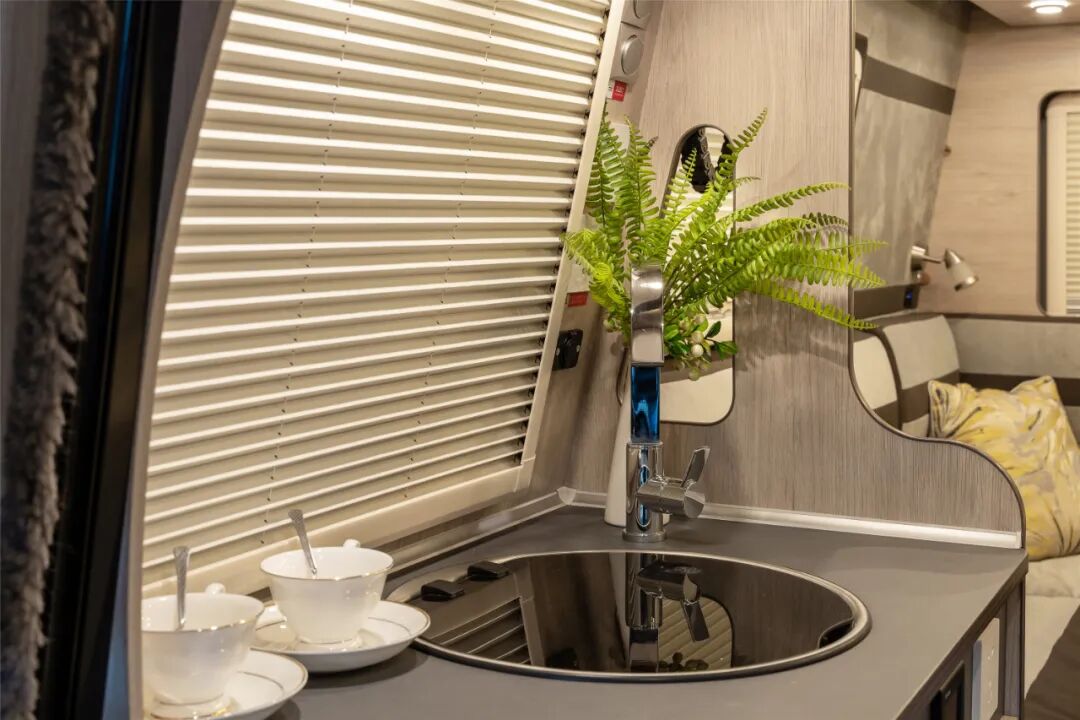 厨房区位于车厢中部,配备美国赛特福德(THETFORD) 原装进口SBL3000一体式水盆(带盖)、德国瑞驰REICH原装进口高弯水笼头;下方配有三组空间可观的抽拉式抽屉,可存放日常碗具及其它物品。