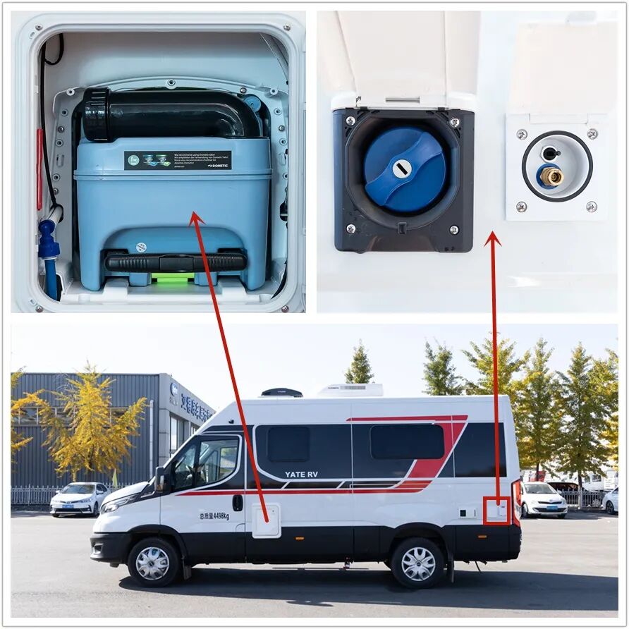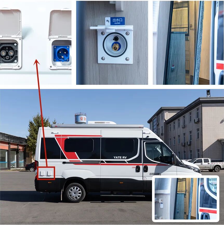 主驾驶一侧,从前到后依次是马桶黑水箱,Truma排烟口,房车专用ABL外接注水口(重力注水)和自吸加水口,并配有自吸加水系统、德国lilie原装进口水泵(带前置过滤器)和德国瑞驰REICH原装进口净水过滤器。两个不同原理注水口的设计,可以方便车友在不同环境下为净水箱加水,保证用水无忧。
