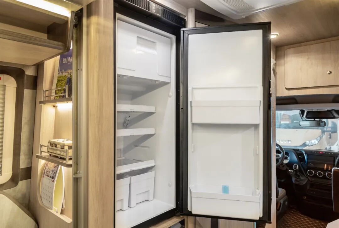 厨房对面是美国赛特福德(THETFORD) 原装进口90L直流冰箱,冷藏冷冻都可以,日常可存储生活食材,可保证路途中食材的新鲜度。