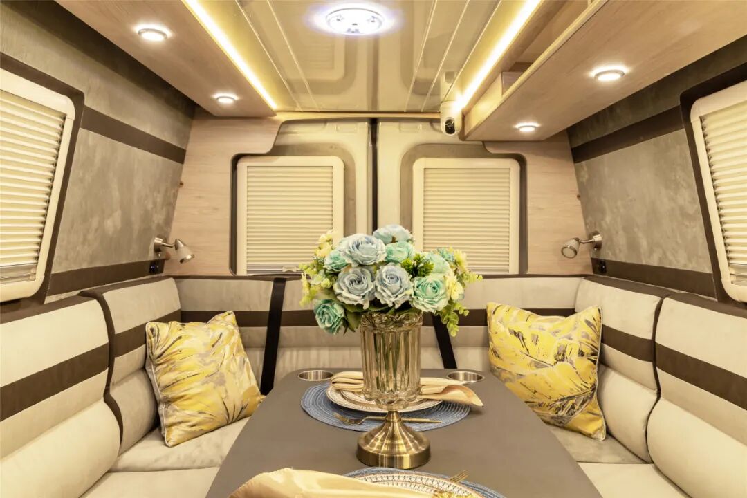车尾会客休闲区采用U型高档卡座沙发设计,沙发坐垫厚实乘坐舒适,搭配一张德国原装进口升降式餐桌,临时可拼成一张尺寸为1900×1700(mm)的沙发床;三面墙壁上均设有窗户,并配有隐私帘,保持通风换气的同时也保证了隐私性;周围阅读灯可供夜晚看书使用。