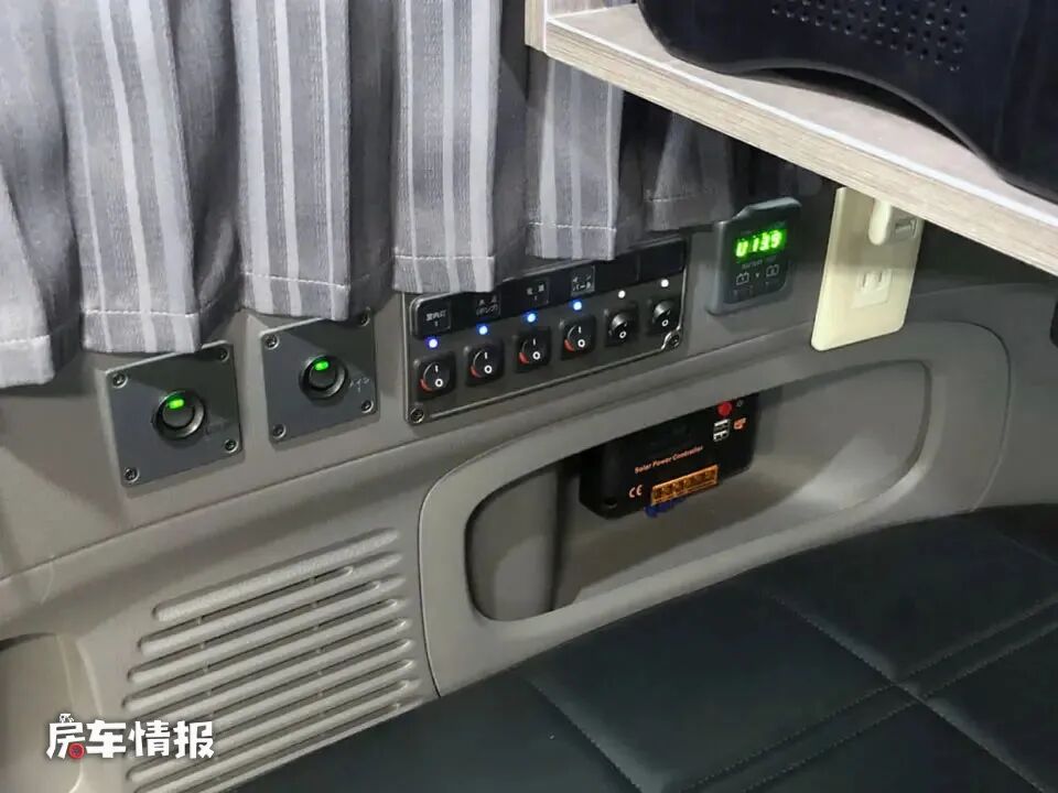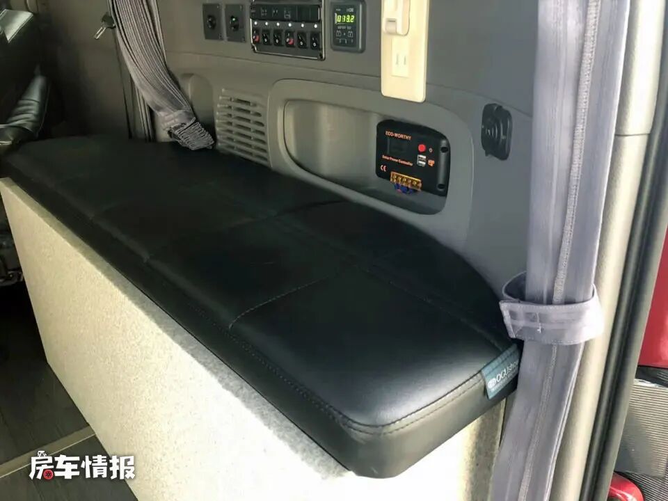 而另外一边的箱体是一个带有沙发垫的座椅,侧面壁板上则是全车的水电控制面板,不过由于设置的位置较低,平时还是谨防误操作。