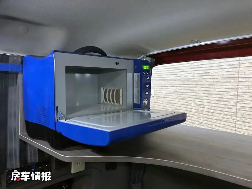 床尾处上方提供了一个悬挂的小桌板,上方配备了一台14寸的可折叠的电视和一台微波炉,平时可以躺下睡觉的时候也可以看看电视放松一下,微波炉也方便平时热饭热菜。