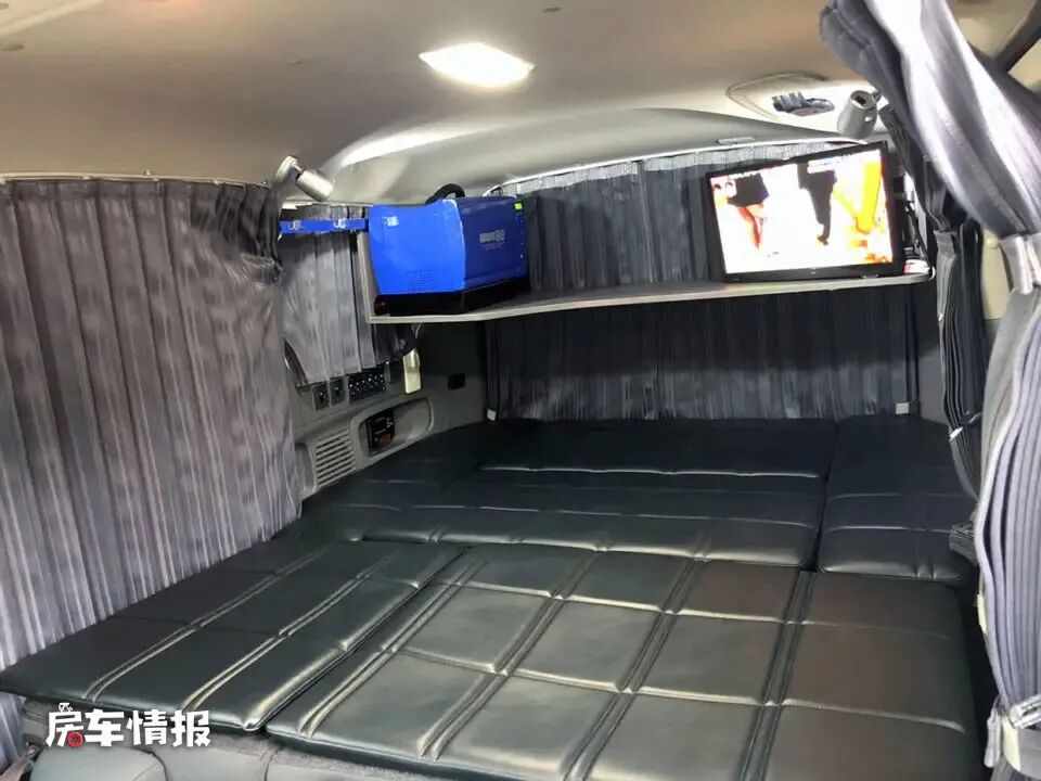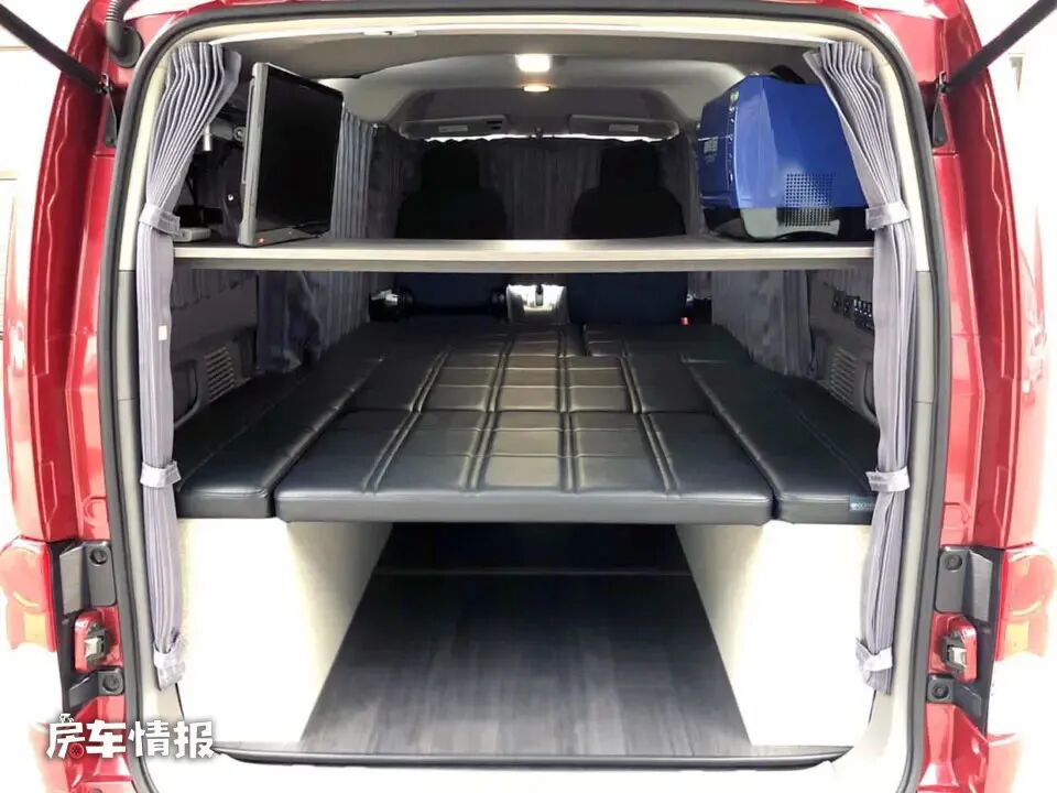 晚上需要睡觉的时候,将沙发座椅放倒,与尾部的床垫拼接成一张大号的双人床,也可以容纳两个成年人休息使用。