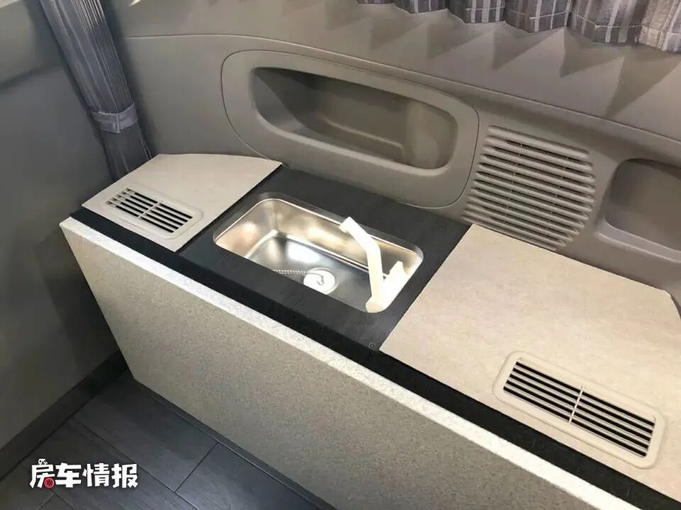 两边的箱体,其中一边提供了一个小型的不锈钢水槽,平时可以在这里刷牙洗脸或者洗菜洗水果。