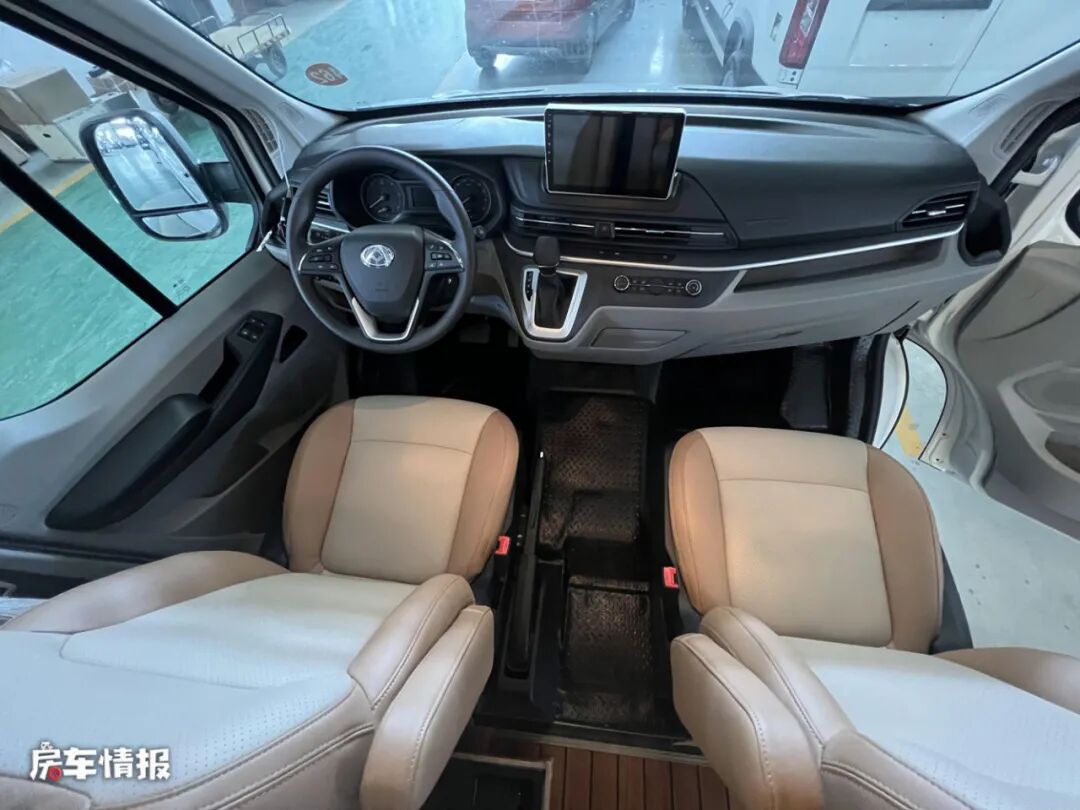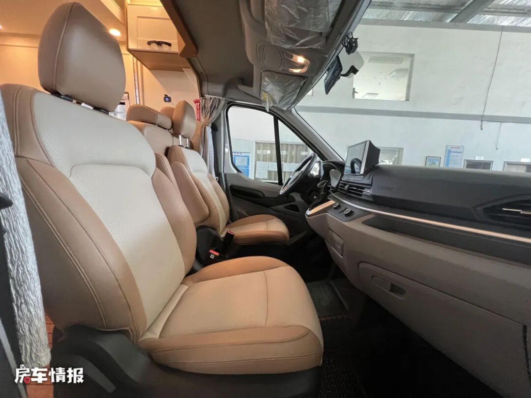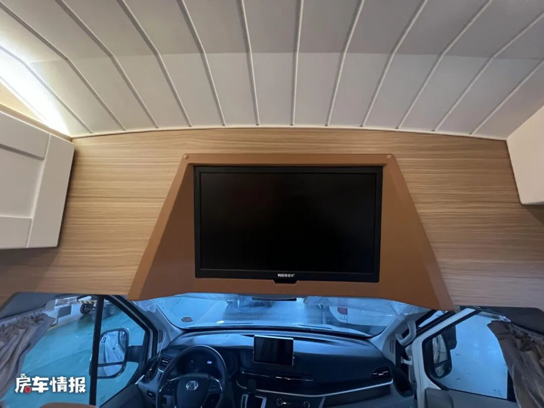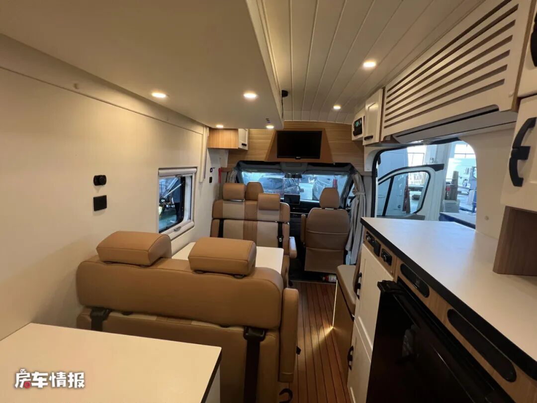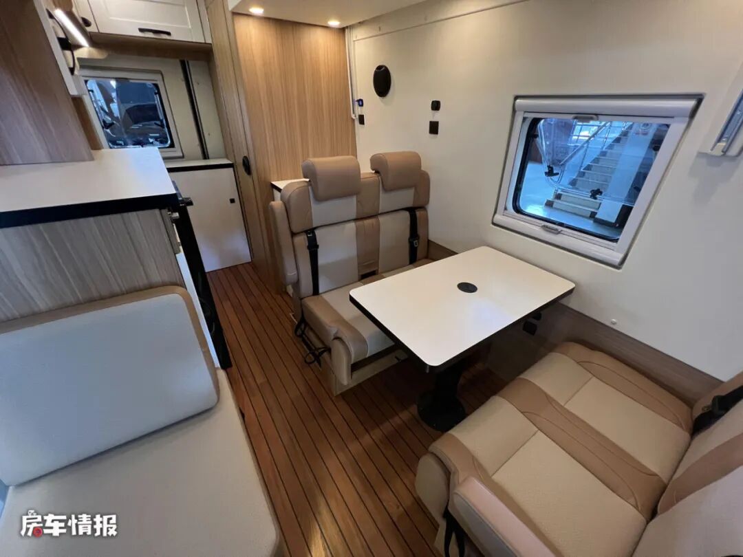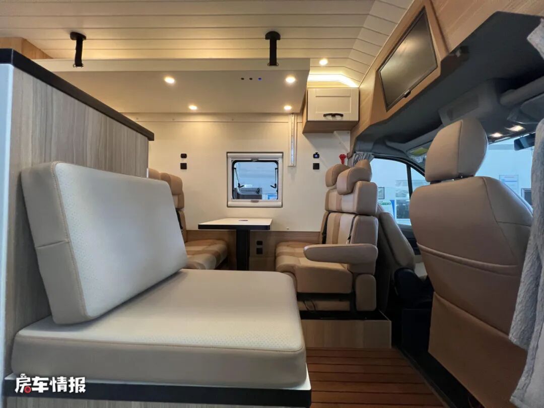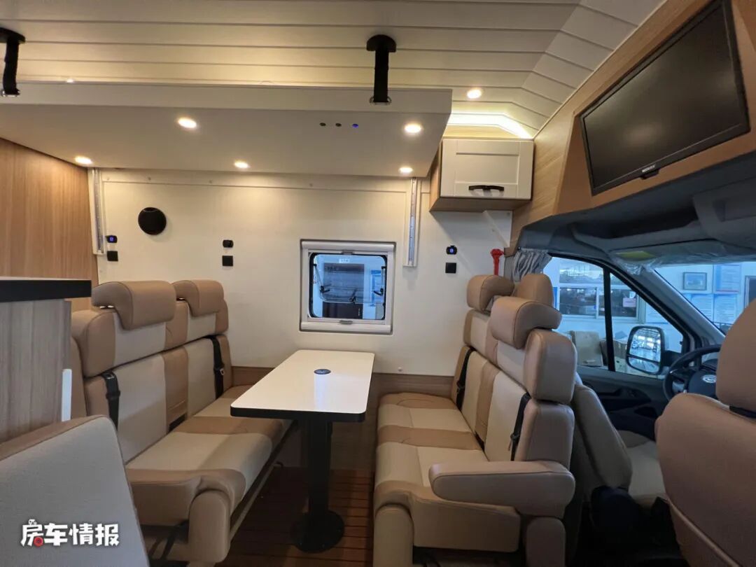 车内的会客区采用了四人对卡座的设计,所以日常整辆车最多可以核载6个人,沙发座椅都采用了乘用车级别的设计,皮质包覆工艺,填充厚度也不错,带有头枕和扶手,乘坐的舒适度也还不错,晚上还可以结合成一张小型的单人沙发床使用,最前方驾驶室顶部还有一台液晶电视,日常休息的时候也可以看一些简单的娱乐节目。