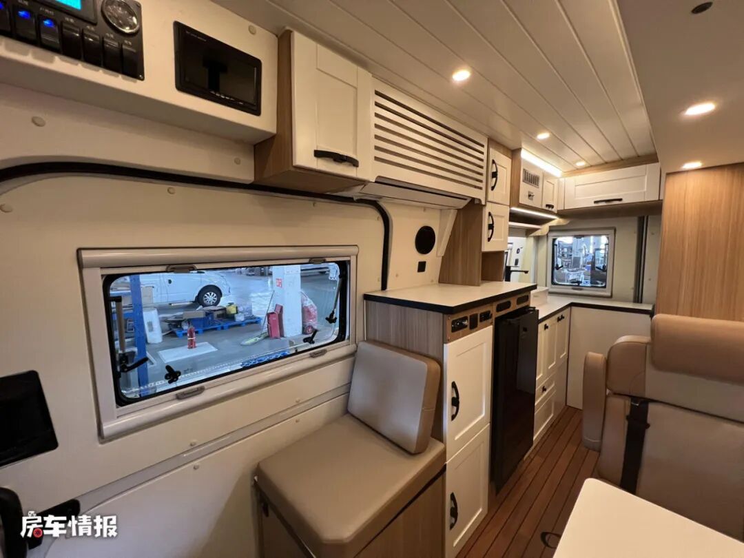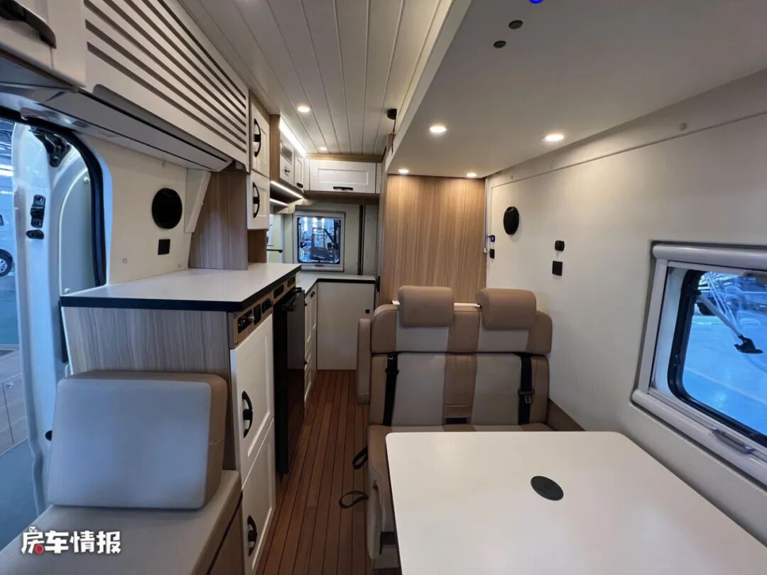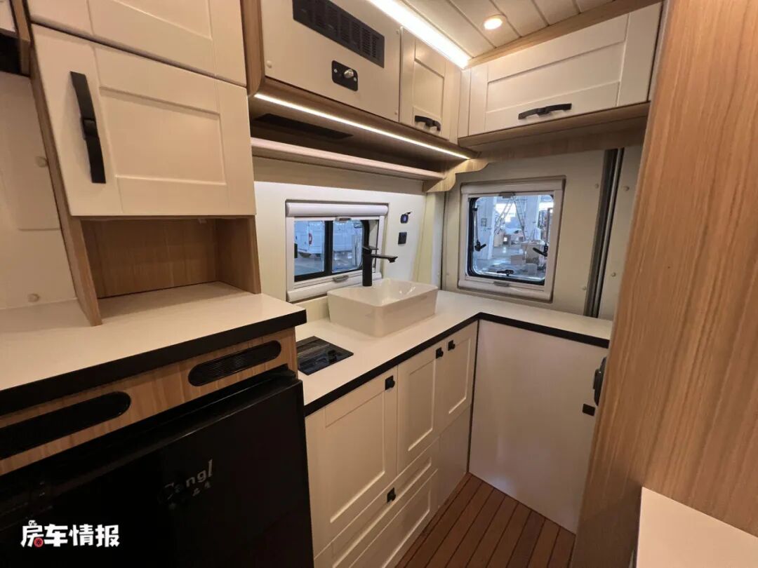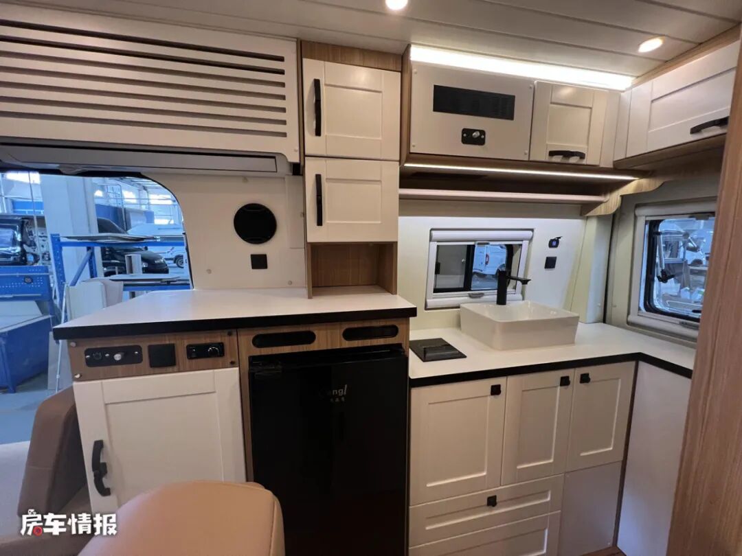 下面就要说一下这款车的亮点设计,就是全车的厨房区域,从乘客门一直延伸到车厢尾部,呈一个L型的吧台设计,而且是高低台面的设计,最前方是一个可以备菜的区域,下方带有一台108L的车载冰箱,也能够存放一些简单的食材。顶部还有一台隐藏在面板后方的家用变频空调,能够为车内打造一个比较舒适的居住环境。