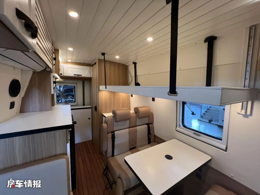 进入车厢内部,和我们日常所见的温馨内饰风格不太一样,整辆车的壁板和天花板都采用了白色系,尤其是顶部的天花板,类似夹板的设计更突显了清新小众的风格。而整体的布局也非常类似C型房车内部的设计,虽然底盘的尺寸空间有限,但是结合这样的布局还是给人很新颖的感觉,让人眼前一亮。