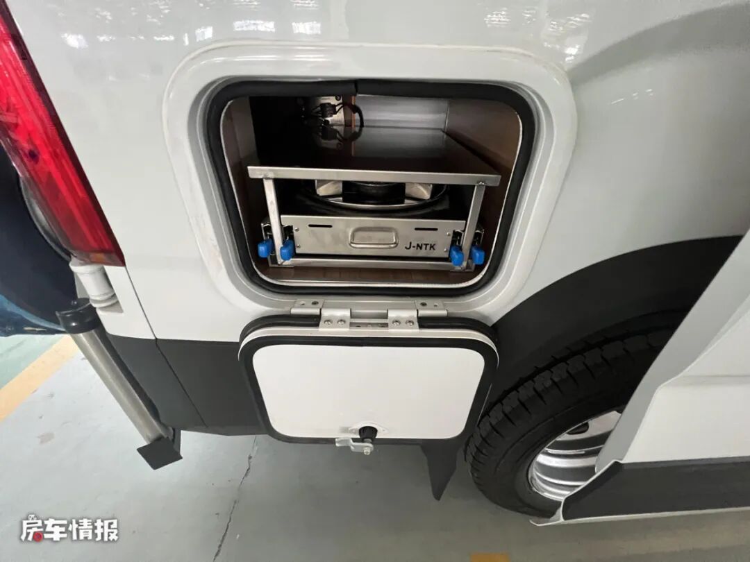 车身外部也提供了比较简单的生活配置,包括手动的遮阳棚、外置的抽拉燃油灶、外置备胎以及拖车方口等,可以满足日常的生活需求,天气好的时候还可以在户外营造一个简单的就餐休息区域。