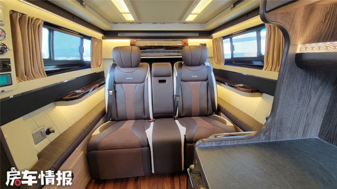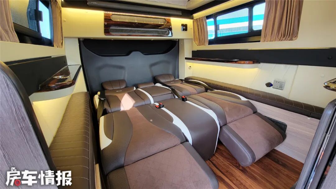 生活区的设计同样兼顾了旅居和日常家用,车厢尾部并没有采用放车上的平板式座椅,而是采用了更为舒适的商务车座椅,可以电动调节座椅靠背、前后、腿托等,如果愿意的话,或甚至可以把座椅完全放平,变成一张1700*1700mm的双人床。