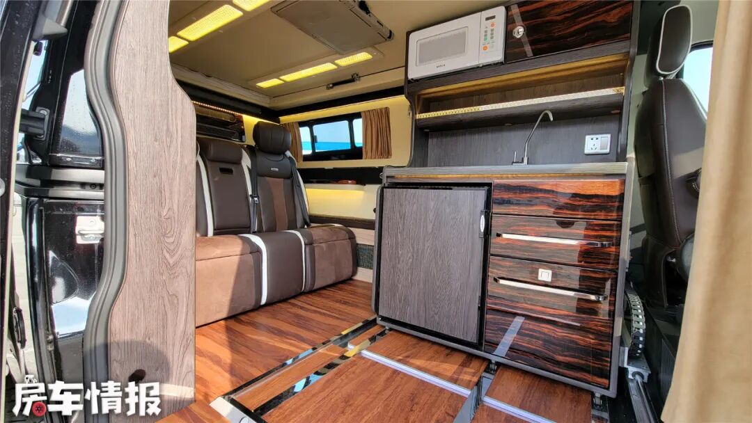车内还提供了一套具有独家专利的抽拉式整体橱柜+厨房的设计,常规状态下,就是一组橱柜,带有洗菜池、冰箱、储物抽屉等;