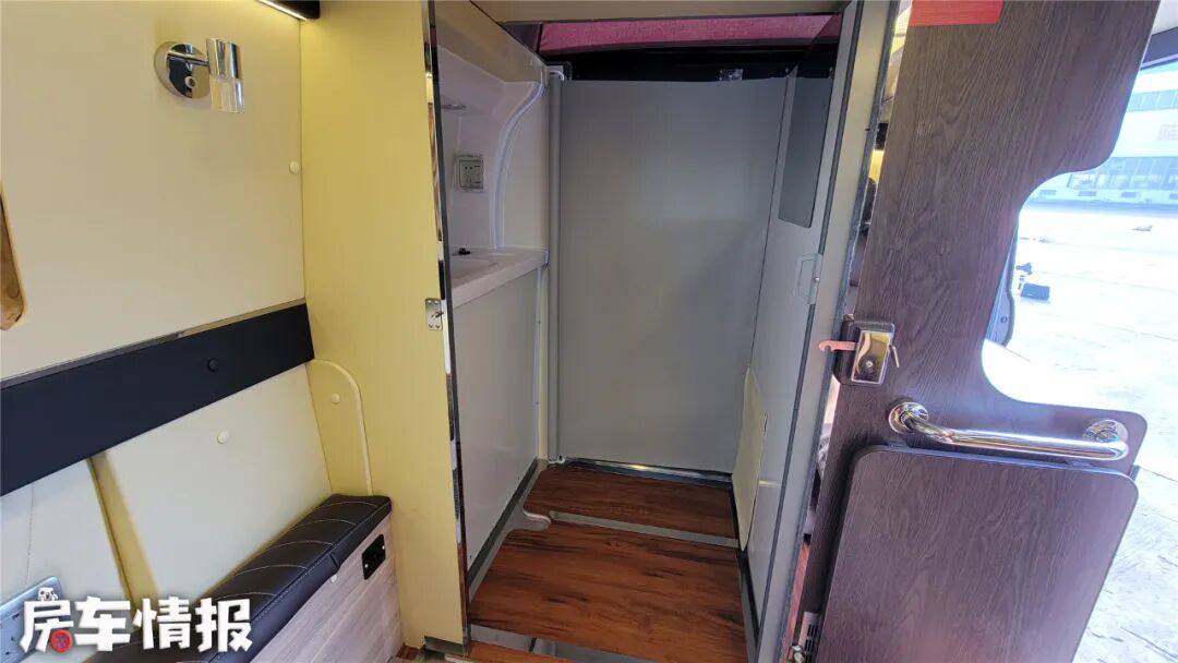 将整套橱柜向外滑动,内部就是一个独立卫生间,搭配淋浴和便携式马桶使用,即便是到了户外也解决个人问题。
