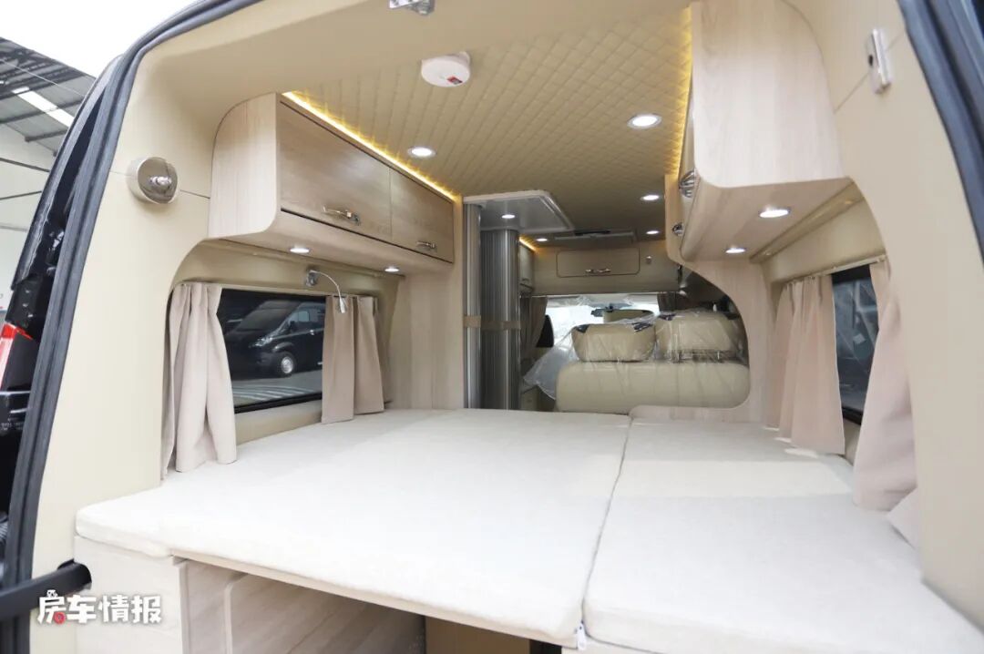 车尾部则提供了一张尺寸约为1700*1300mm的横置双人床,长度稍微有些短,更适合体型较矮的人或小朋友使用。