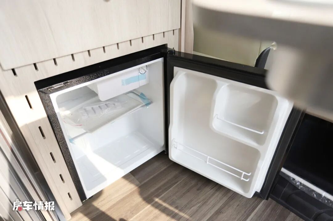 车厢内侧还提供了一个简易厨房操作区域,这带有电磁炉、冰箱等基础设备,另一侧还有简易的淋浴间,夏季露营的时候也能简单冲洗一下,车内提供了105L清水箱和40L的灰水箱。