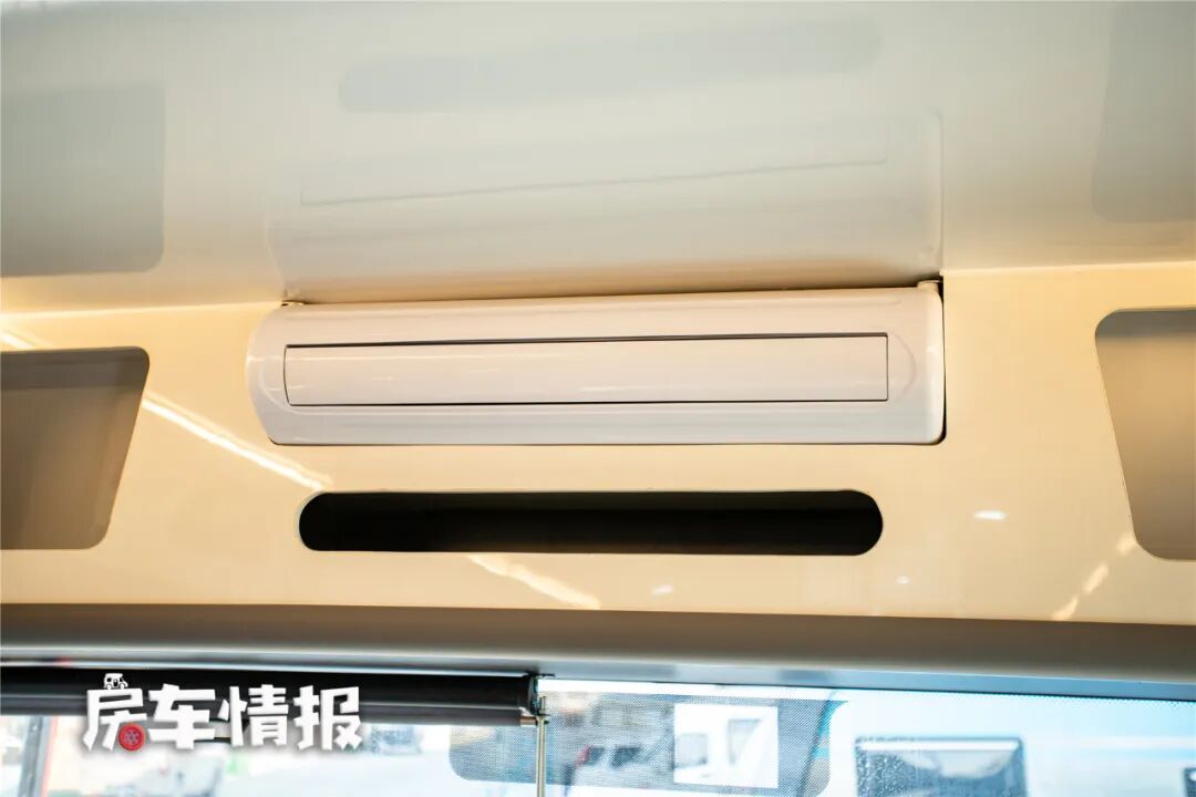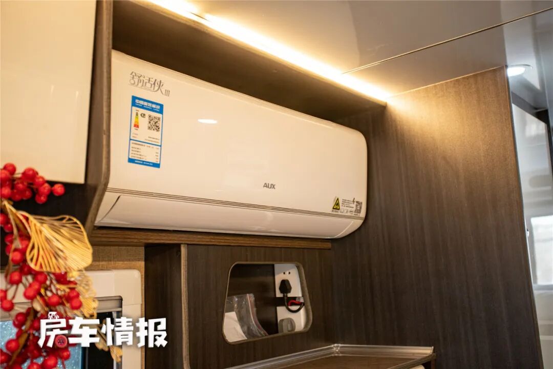 在厨房后方的顶部,还装有一个家用变频空调,可以及时地调节车内的温度,让大家在这个宽敞的房车中享受更加舒适惬意的环境。